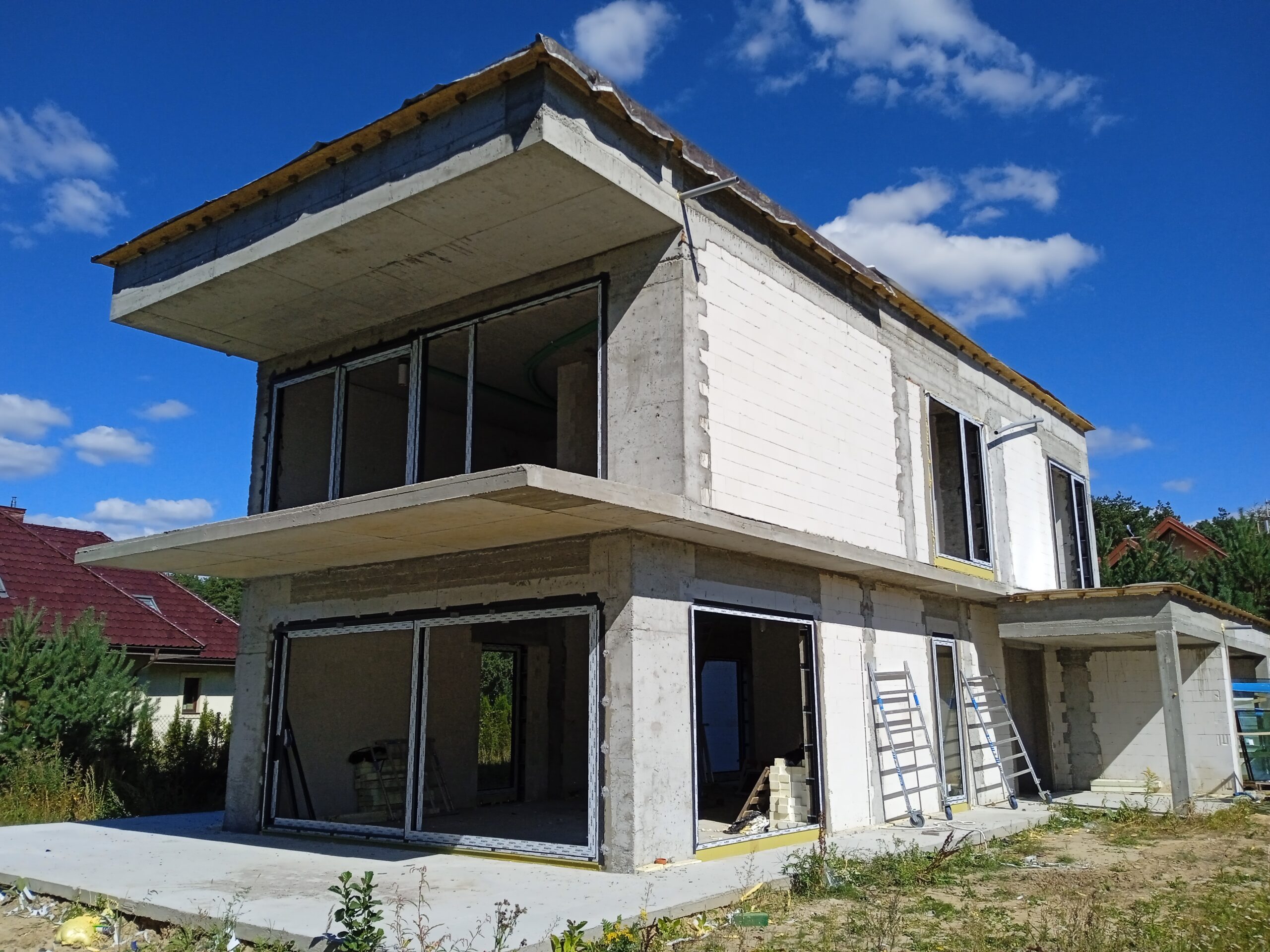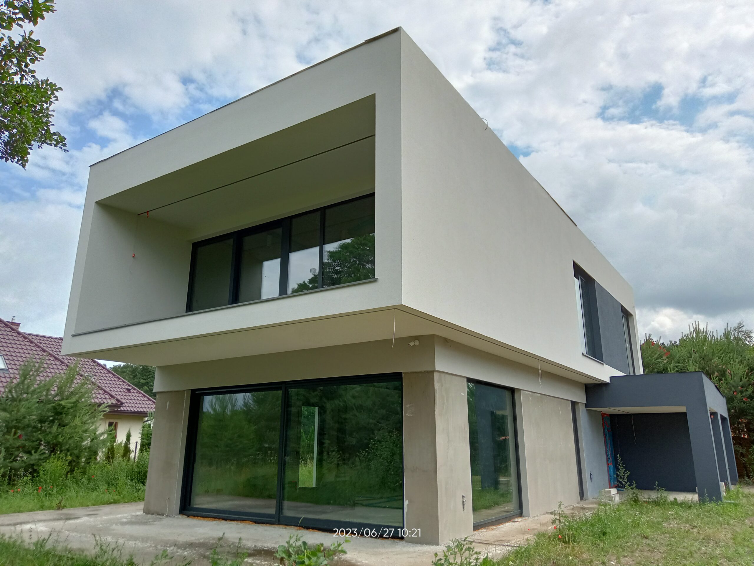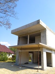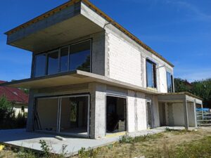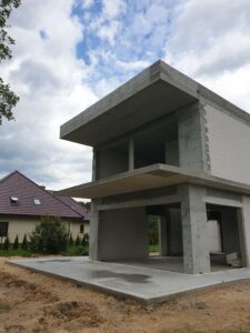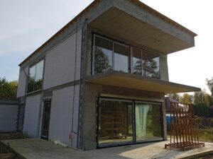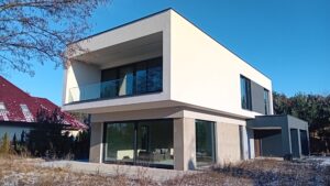Casă cu o suprafață de 221 m2 construită pe o placă de fundație în armătură împreună cu termoizolație de 15 cm grosime. Pereții portanți și cei despărțitori au fost realizați din blocuri silicatice cu grosimi de 25 cm, respectiv 12 cm. Planșeu monolitic. Acoperișul clădirii este plat.