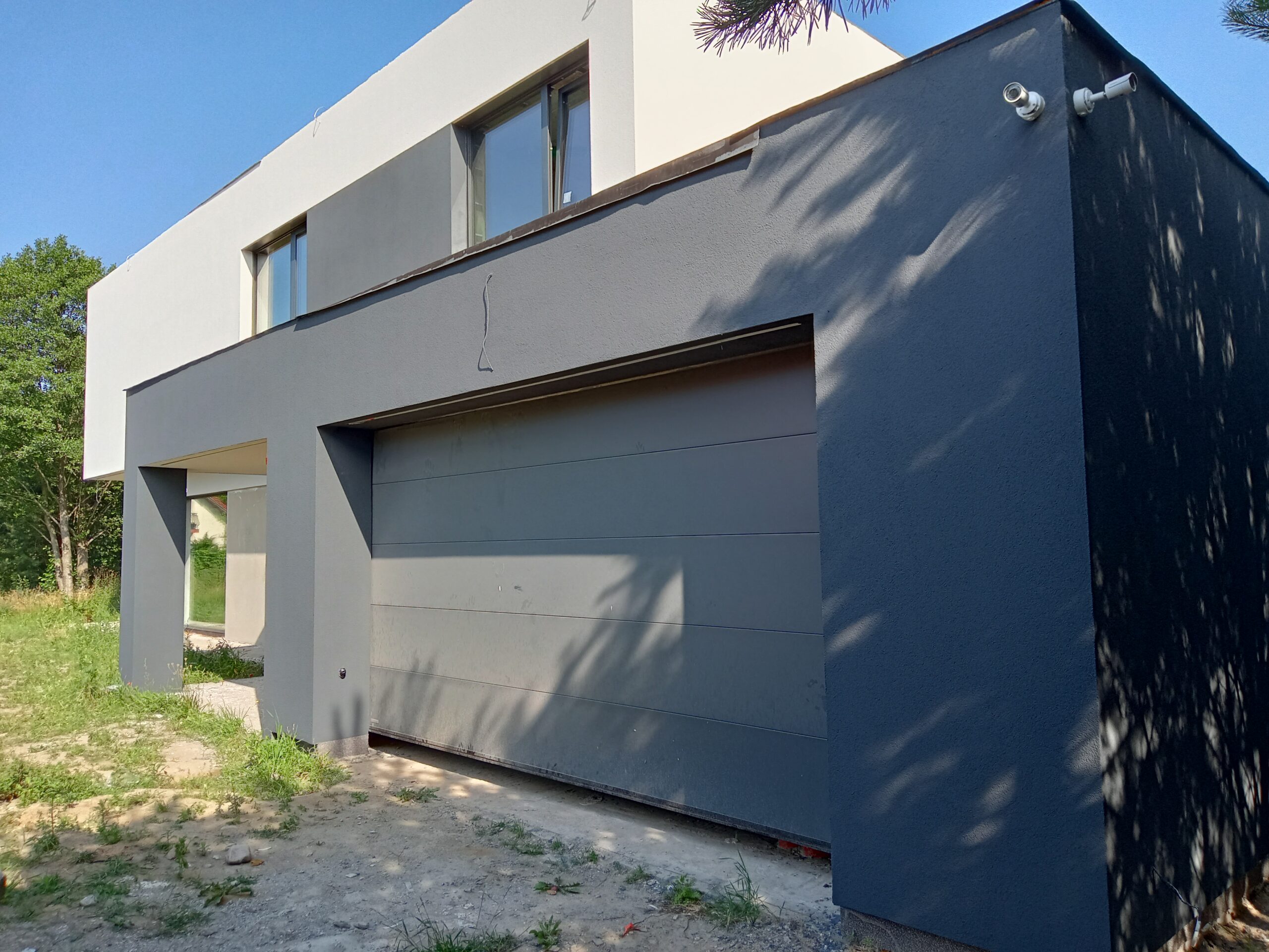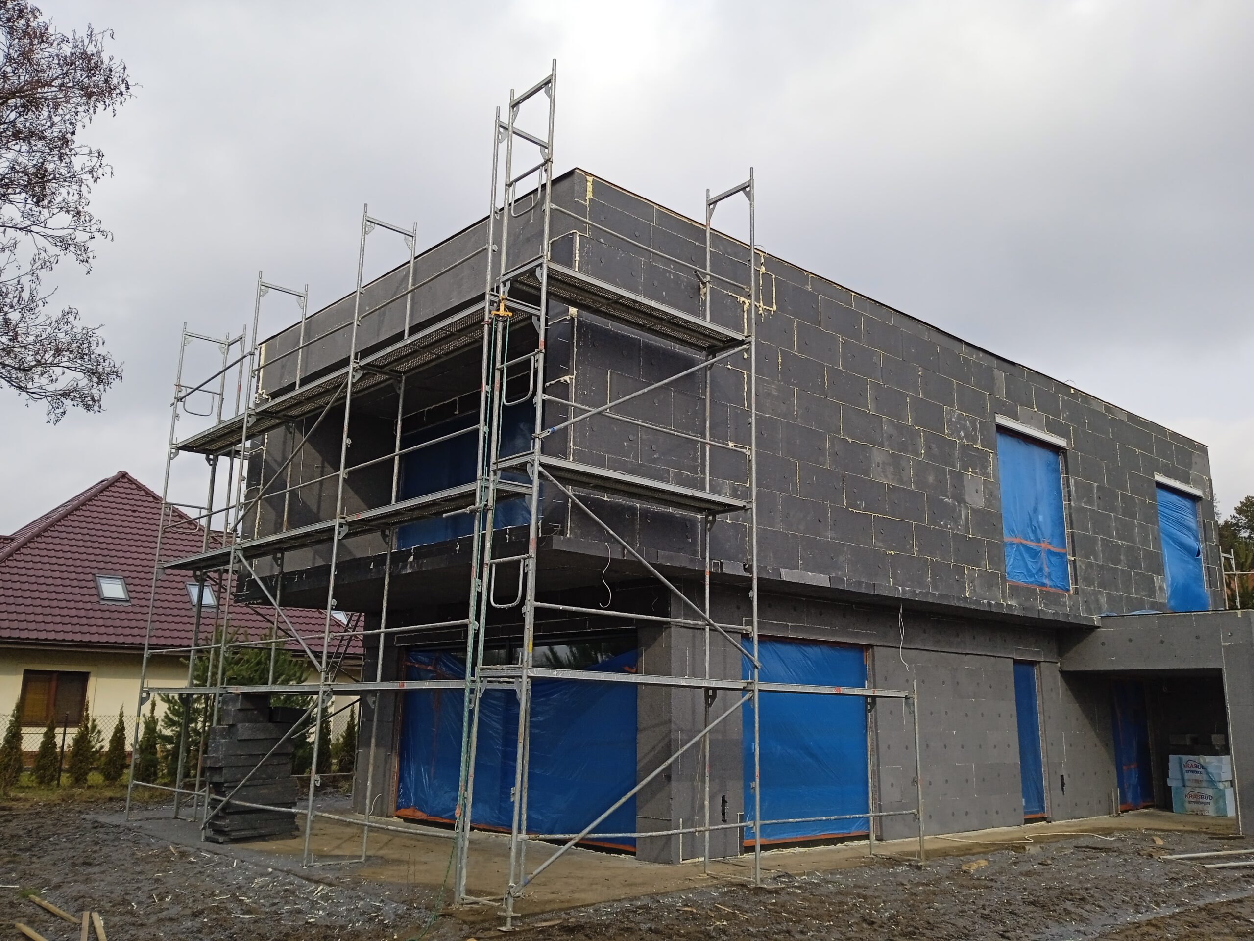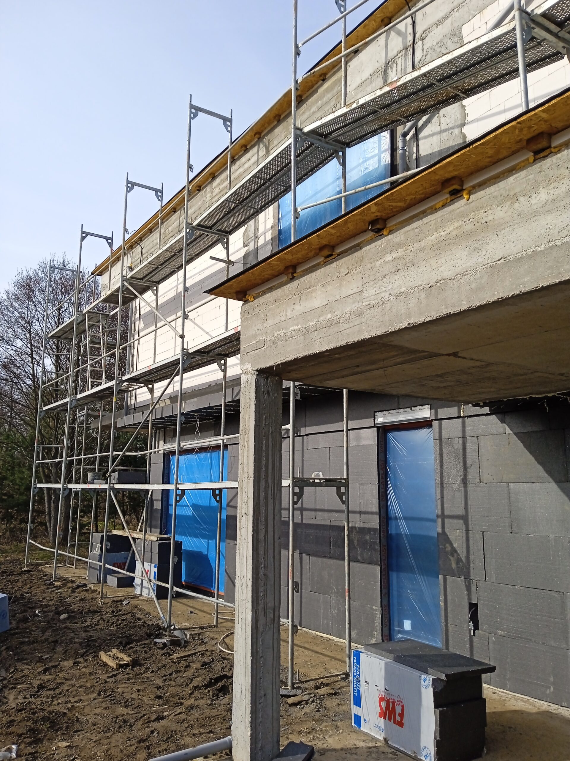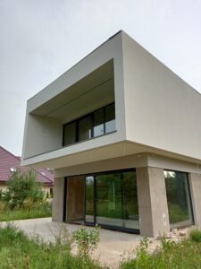 Pentru izolarea pereților exteriori s-a folosit polistiren grafitat cu grosimea de 20 cm, iar clădirea a fost finisată cu tencuială siliconică de culoare albă.
