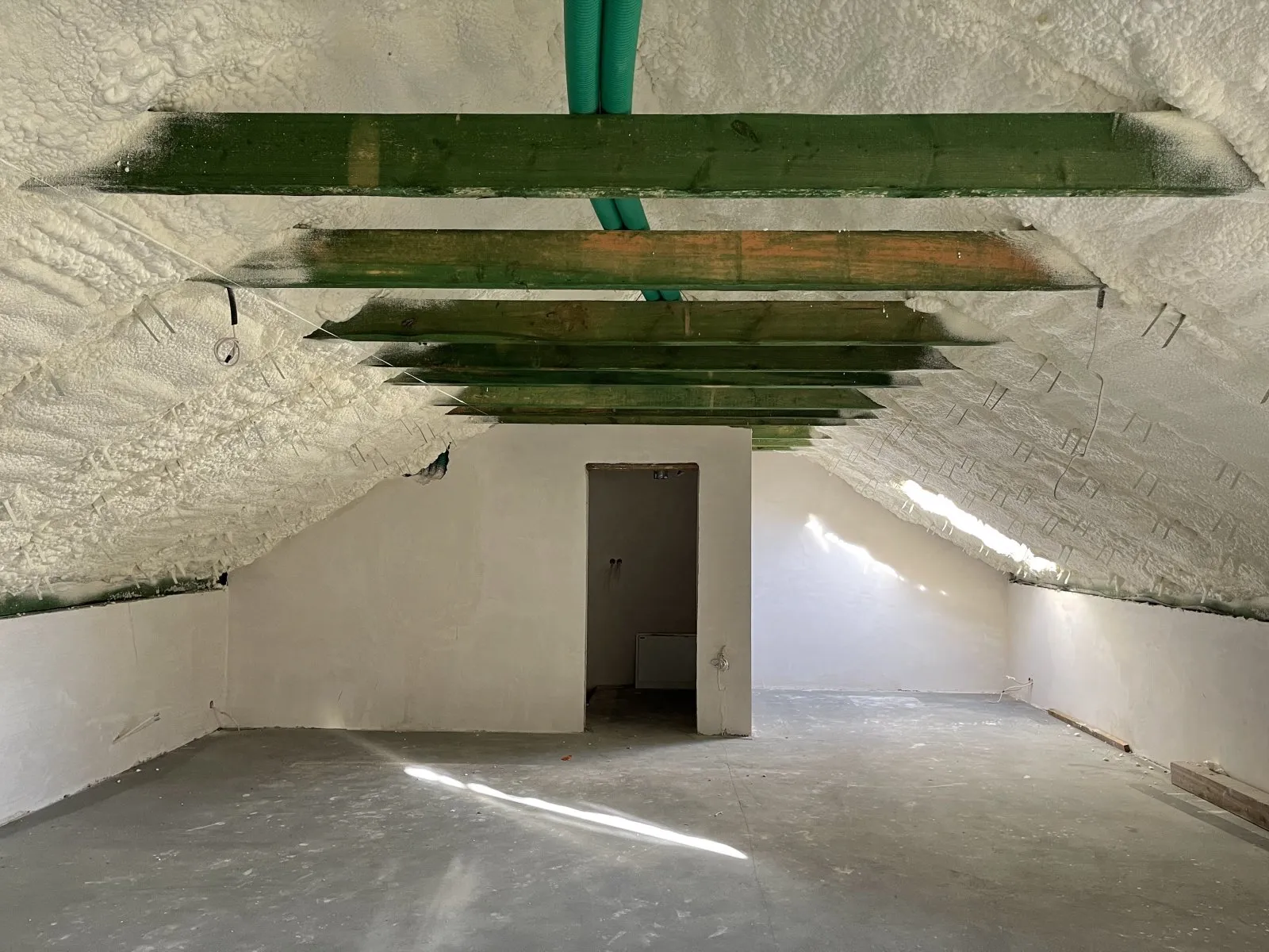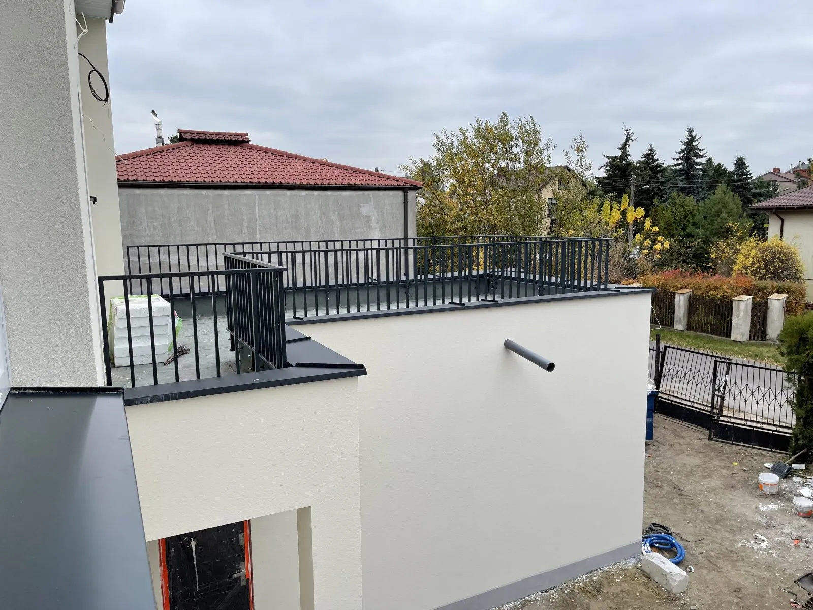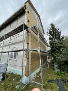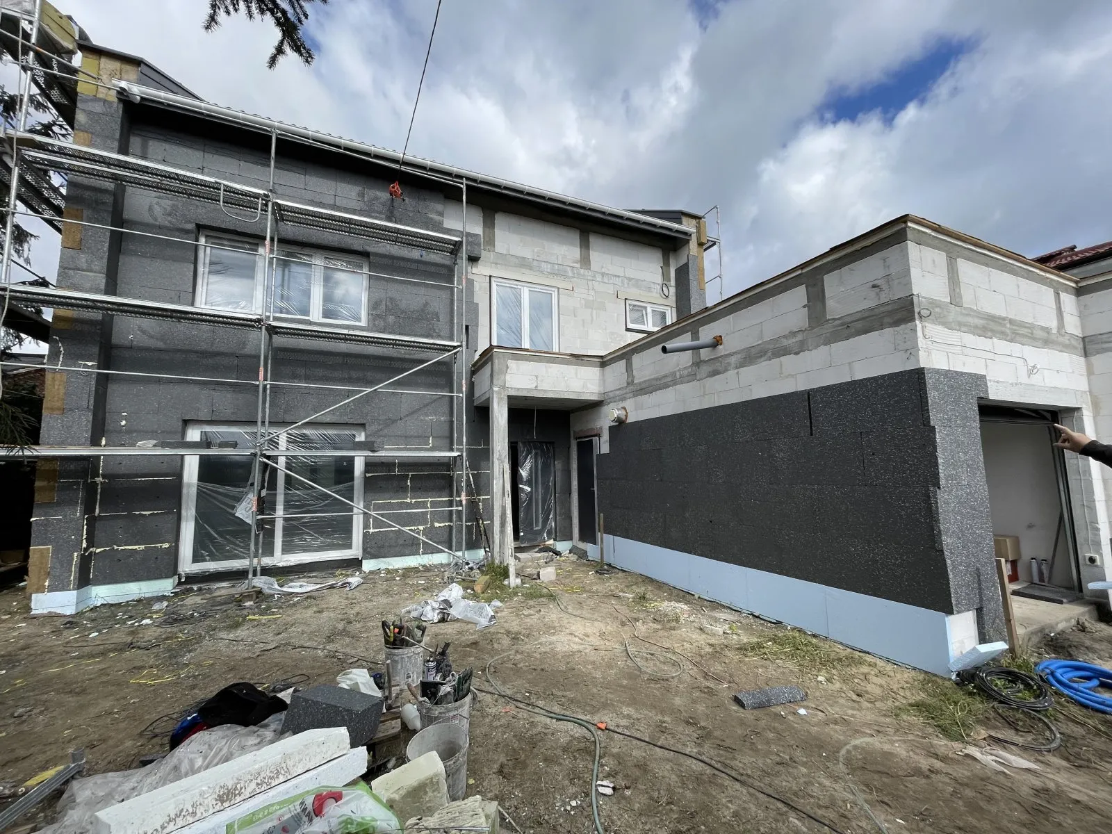 Pentru izolarea pereților exteriori a fost utilizat polistiren grafitat cu grosimea de 20 cm, iar pentru finisarea fațadei clădirii s-a folosit tencuială siloxanică de culoare albă.