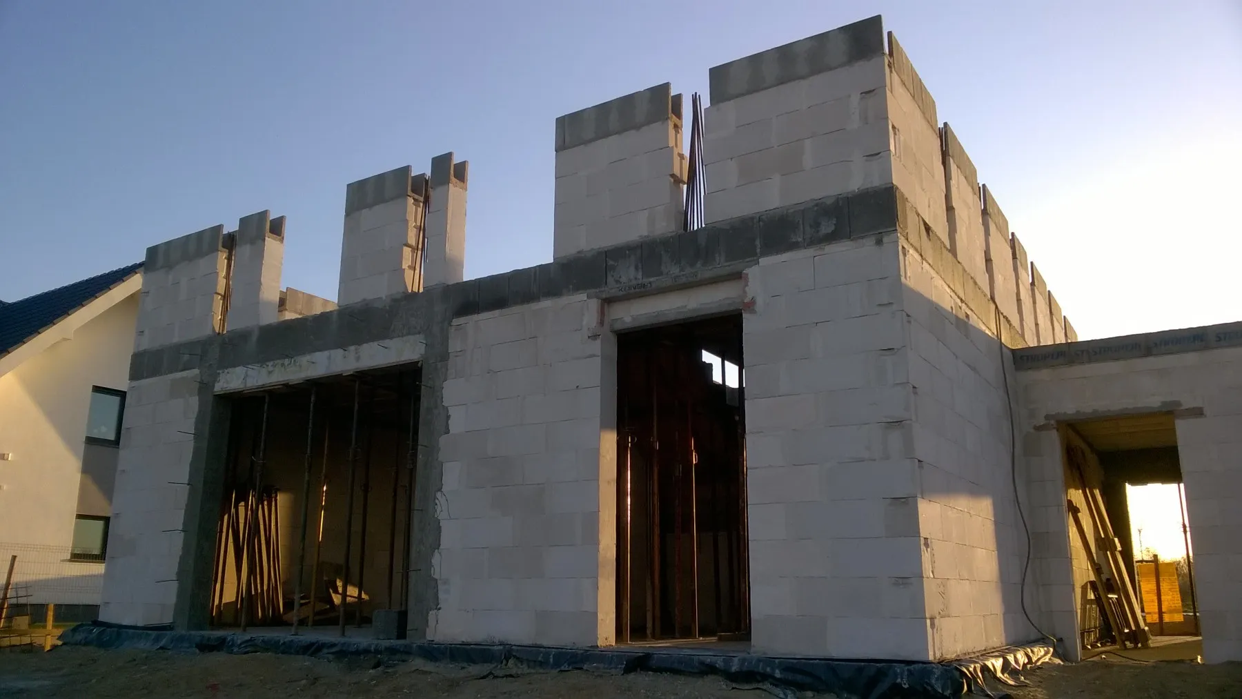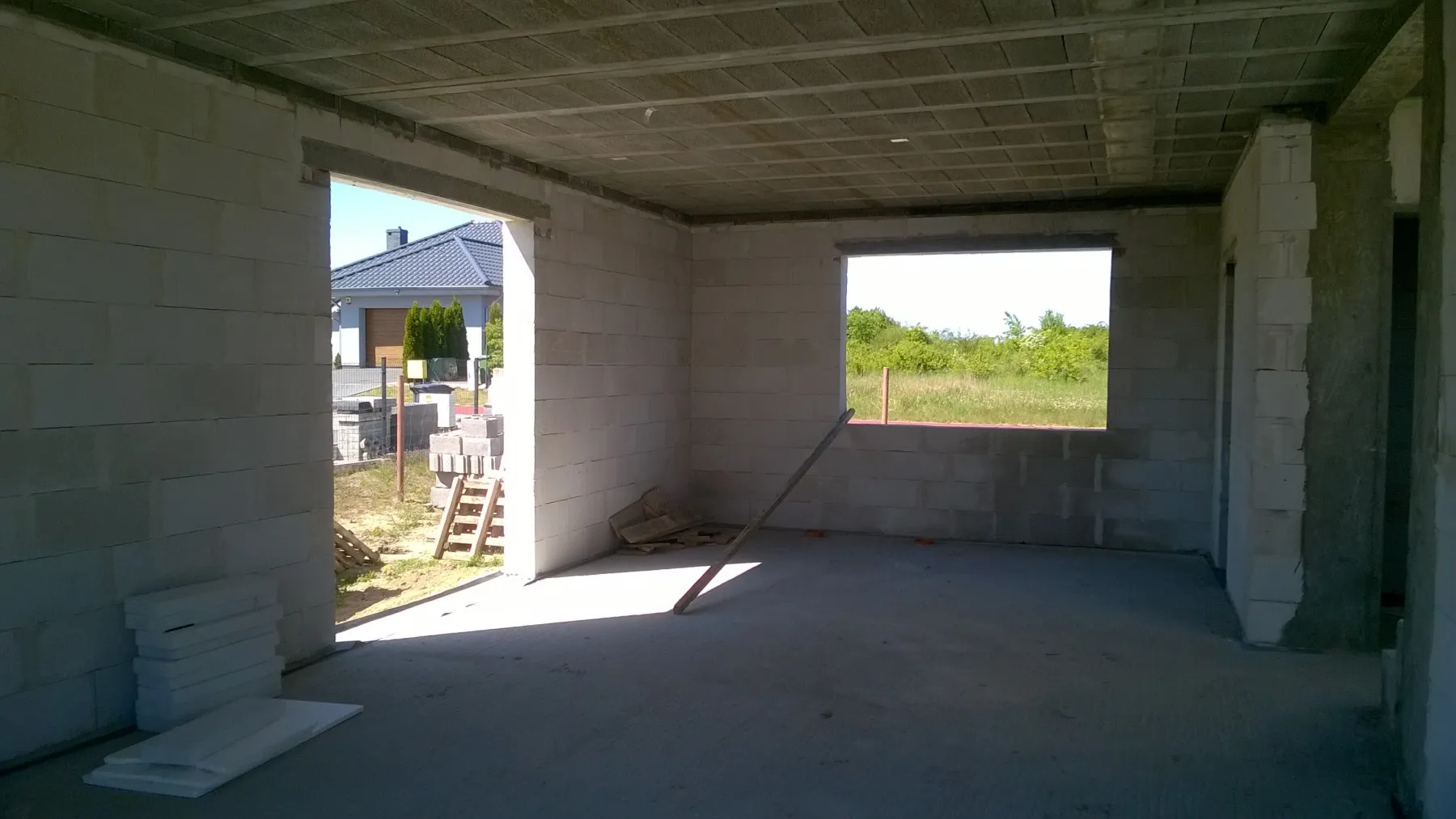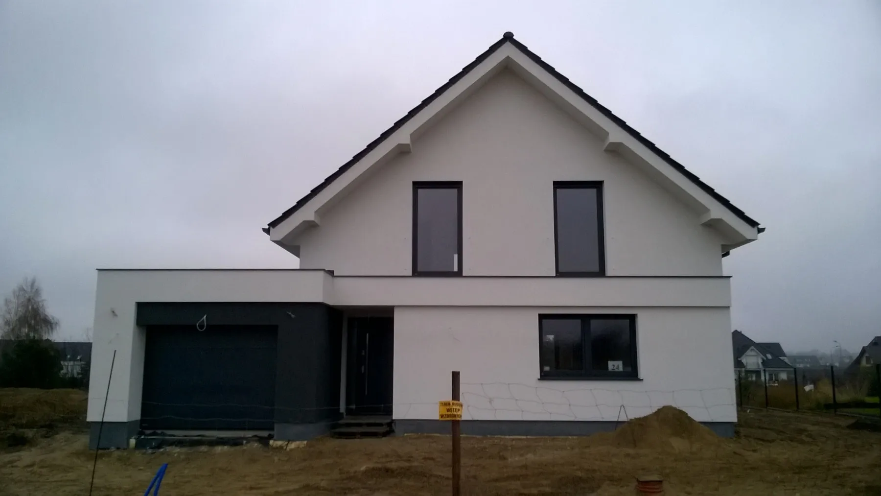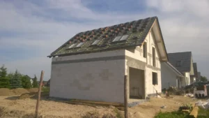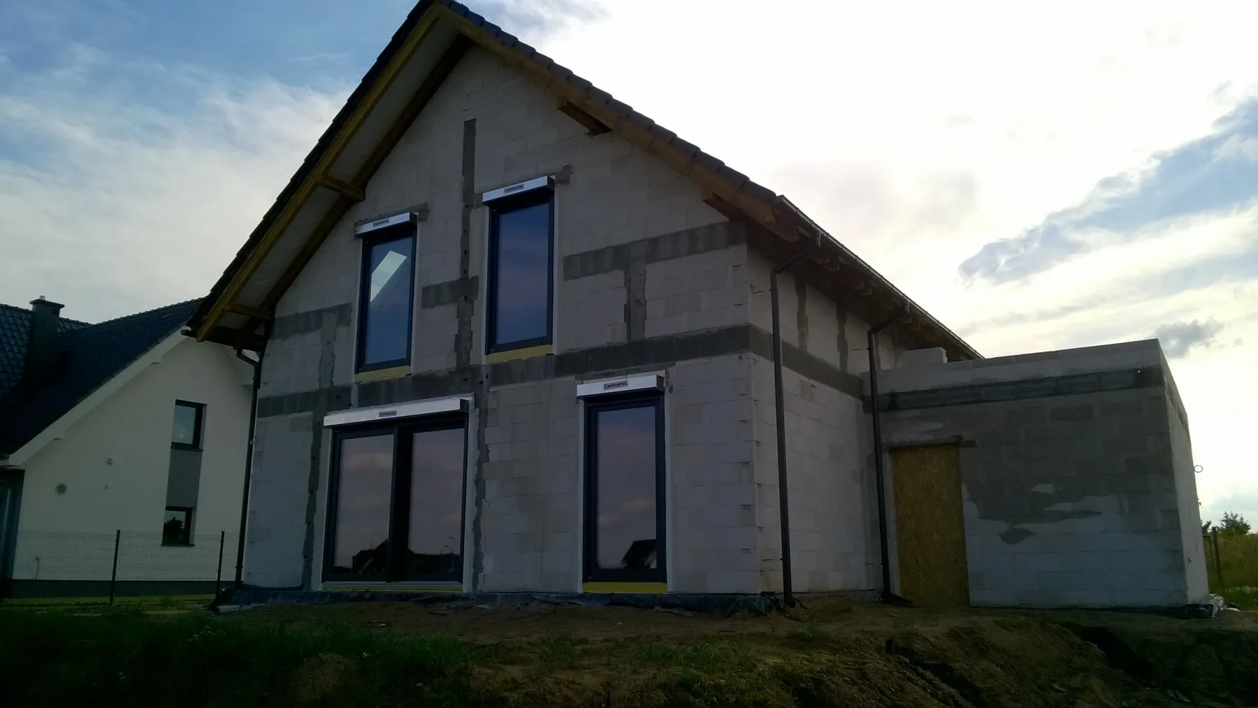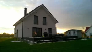 Casă cu o suprafață de 154 m2 ridicată pe o placă de fundație armate. Pereții portanți și despărțitori au fost realizați din beton celular cu grosimi corespunzătoare de 24 cm și 12 cm. Tavanul parterului este un tavan cu grinzi dense de tip Teriva, în timp ce tavanul de deasupra garajului este un tavan panou SMART. Acoperișul clădirii este acoperit cu țiglă ceramică ondulată Braas Rubin 9V, de culoare antracit. Structura acoperișului este realizată din lemn de conifere impregnat.
