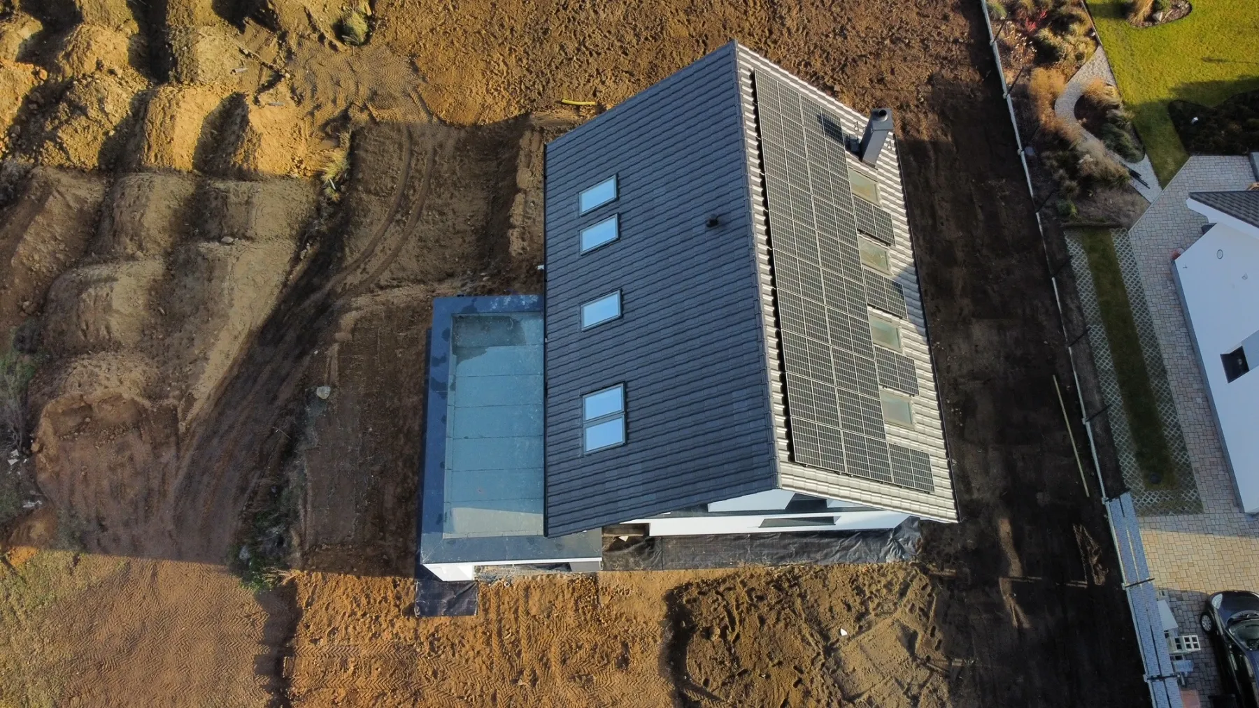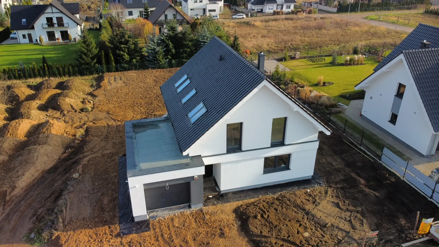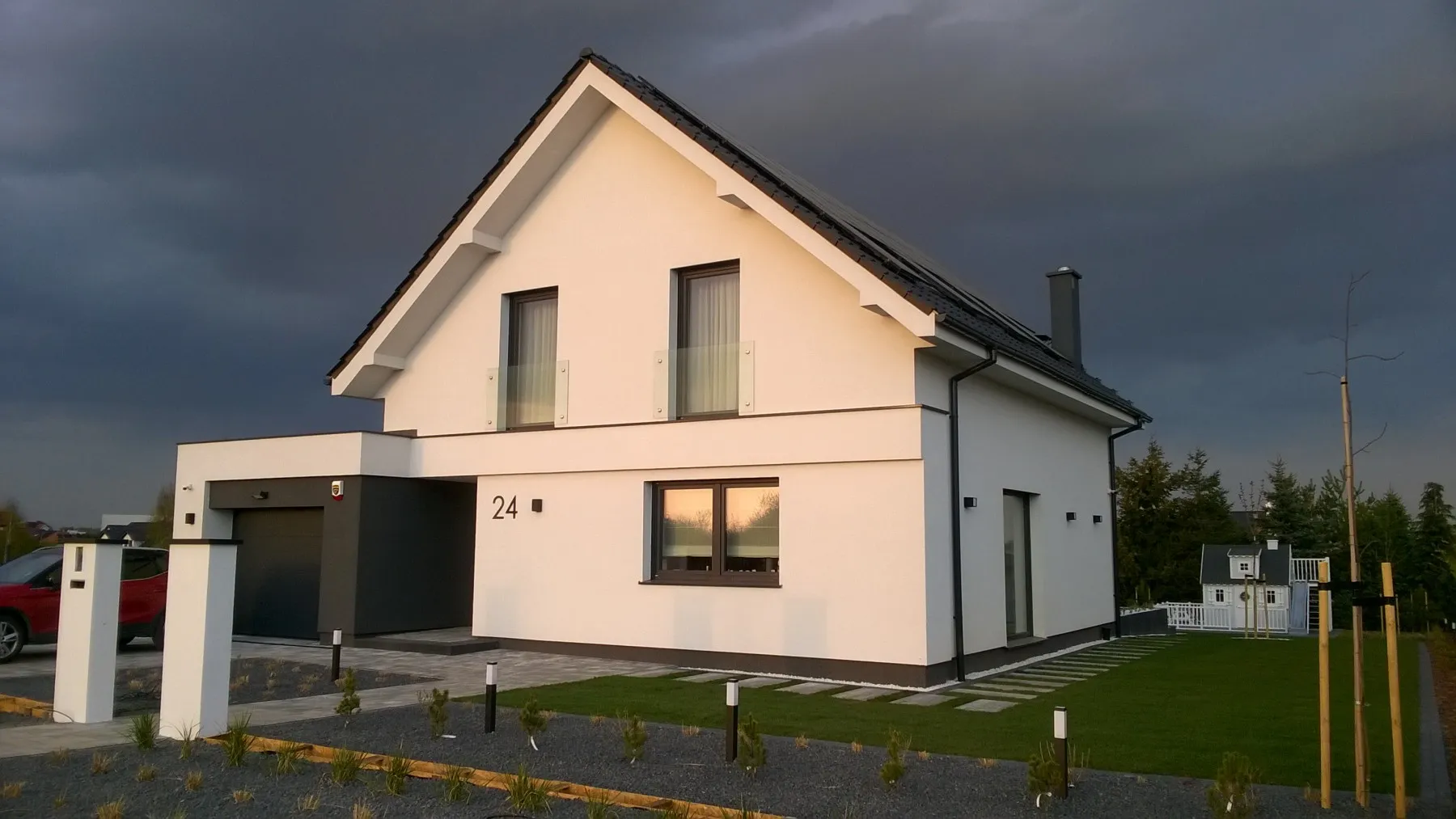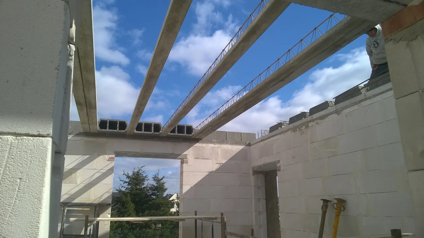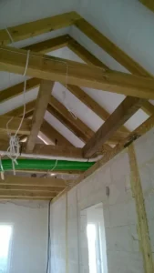 Casă cu o suprafață de 154 m2 ridicată pe o placă de fundație armate. Pereții portanți și despărțitori au fost realizați din beton celular cu grosimi corespunzătoare de 24 cm și 12 cm. Tavanul parterului este un tavan cu grinzi dense de tip Teriva, în timp ce tavanul de deasupra garajului este un tavan panou SMART. Acoperișul clădirii este acoperit cu țiglă ceramică ondulată Braas Rubin 9V, de culoare antracit. Structura acoperișului este realizată din lemn de conifere impregnat.