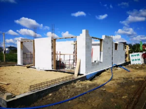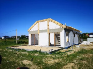 Casă cu o suprafață de 95 m2 ridicată pe fundații tradiționale, adică fundiții încastrate armat și ziduri de fundație izolate. Pereții portanți și despărțitori au fost realizați din beton celular cu grosimea de 24 cm, respectiv 12 cm. Structura acoperișului a fost realizată în mod tradițional conform proiectului, din lemn de conifere impregnat. Acoperișul clădirii a fost acoperit cu țiglă de ciment Braas Teviva.