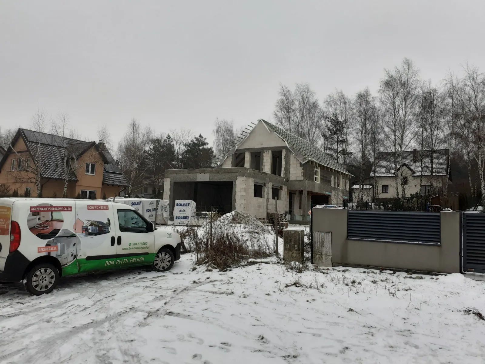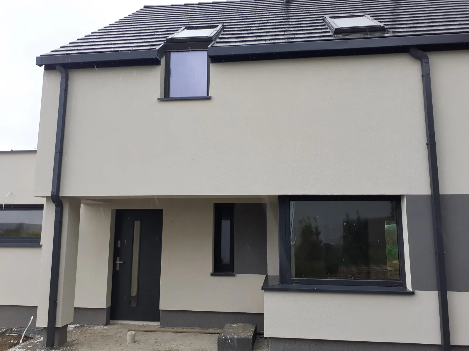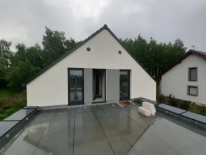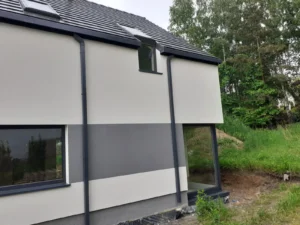Izolarea acoperișului a fost realizată cu spumă PUR de grosimea 22 cm, iar pereții exteriori au fost izolați cu polistiren grafit cu grosimea de 20 cm. Pentru finisarea fațadei clădirii s-a folosit tencuială siliconică de culoare albă.
