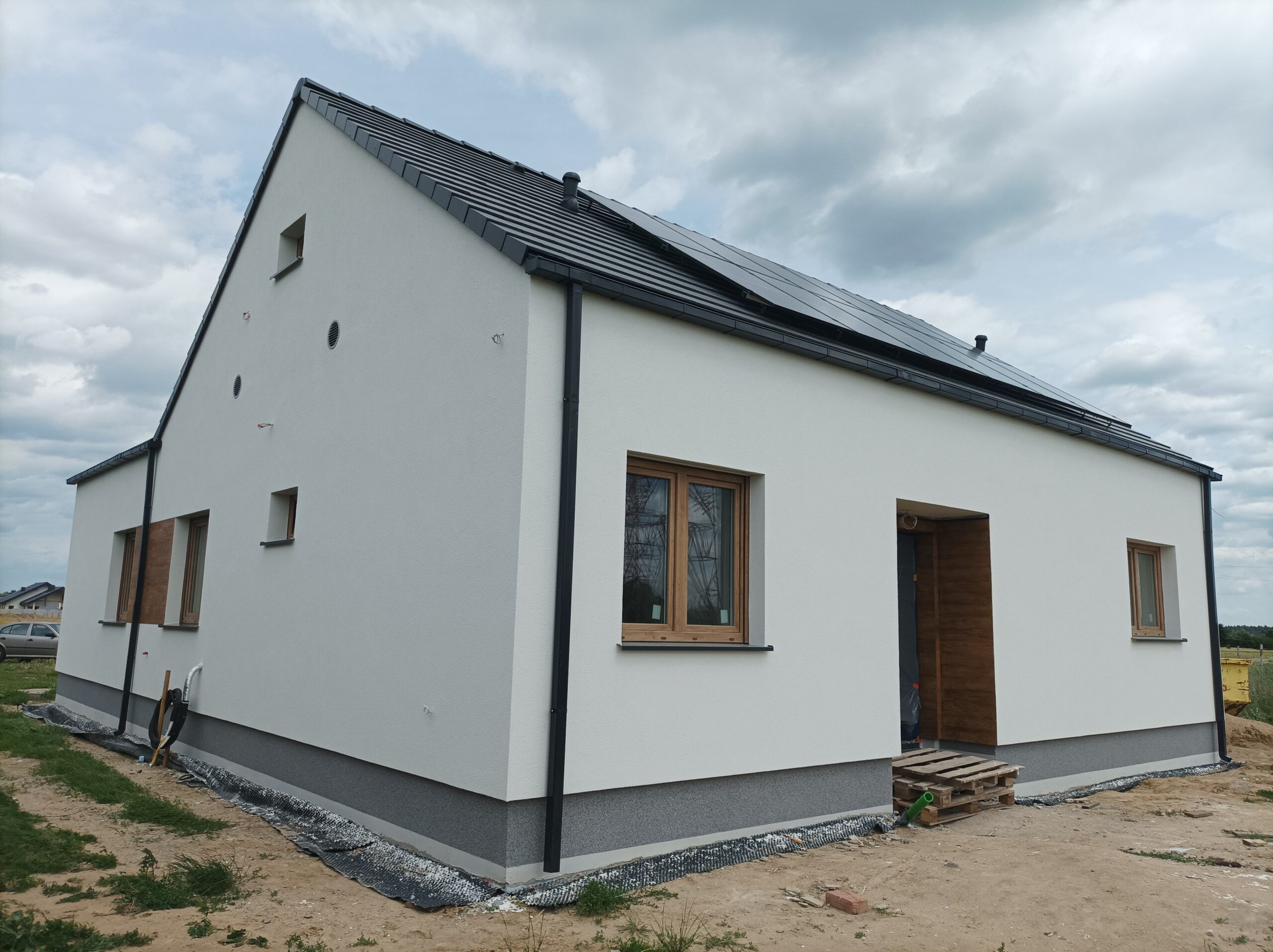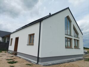 Casă parter energie eficientă cu acoperiș în două ape.