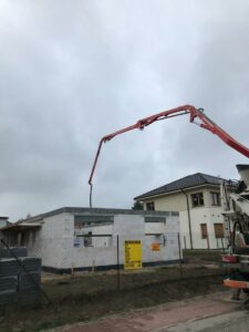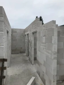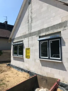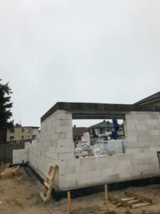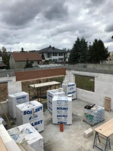 După pregătirea construcției, am început lucrările prin realizarea plăcii fundației cu izolație termică eficientă din polistiren extrudat XPS 300 de 15 cm. Pereții de susținere (grosime de 24 cm) și pereții despărțitori (12 cm) au fost realizați din beton celular folosind adeziv cu rosturi subțiri. Coșul de fum a fost realizat din elemente ceramice.