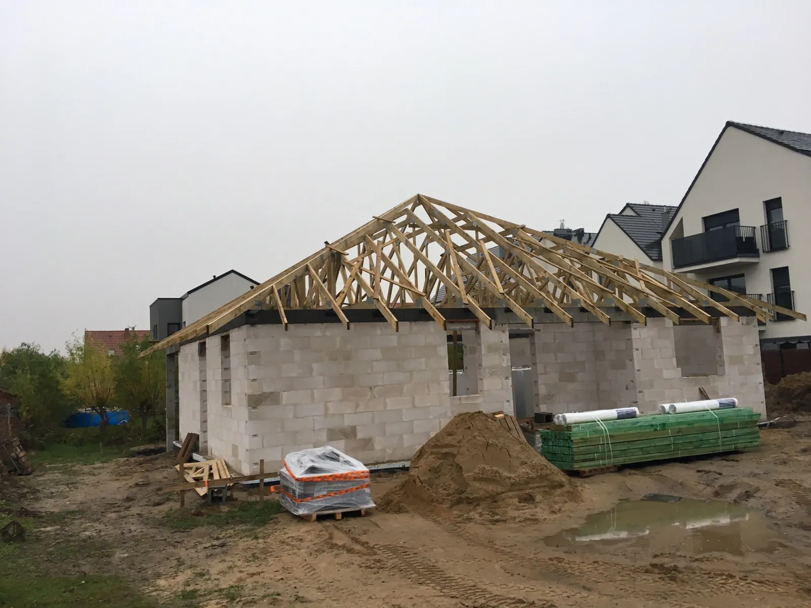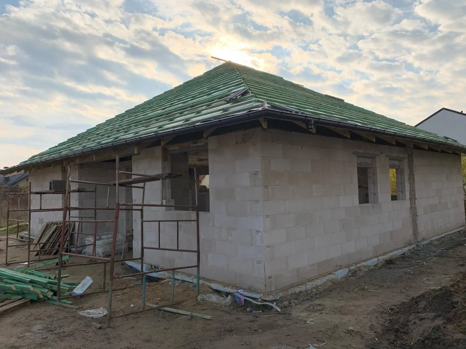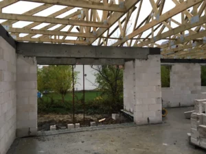 Casă cu o suprafață de 115 m2 construită pe fundații tradiționale, adică benzi armate și ziduri de fundație. Zidurile au fost realizate din beton celular. Structura acoperișului casei și garajului a fost realizată din ferme prefabricate, din lemn șlefuit pe patru fețe de clasa C24, impregnat. Acoperișul clădirii a fost acoperit cu țiglă beton Braas Celtică lumio.