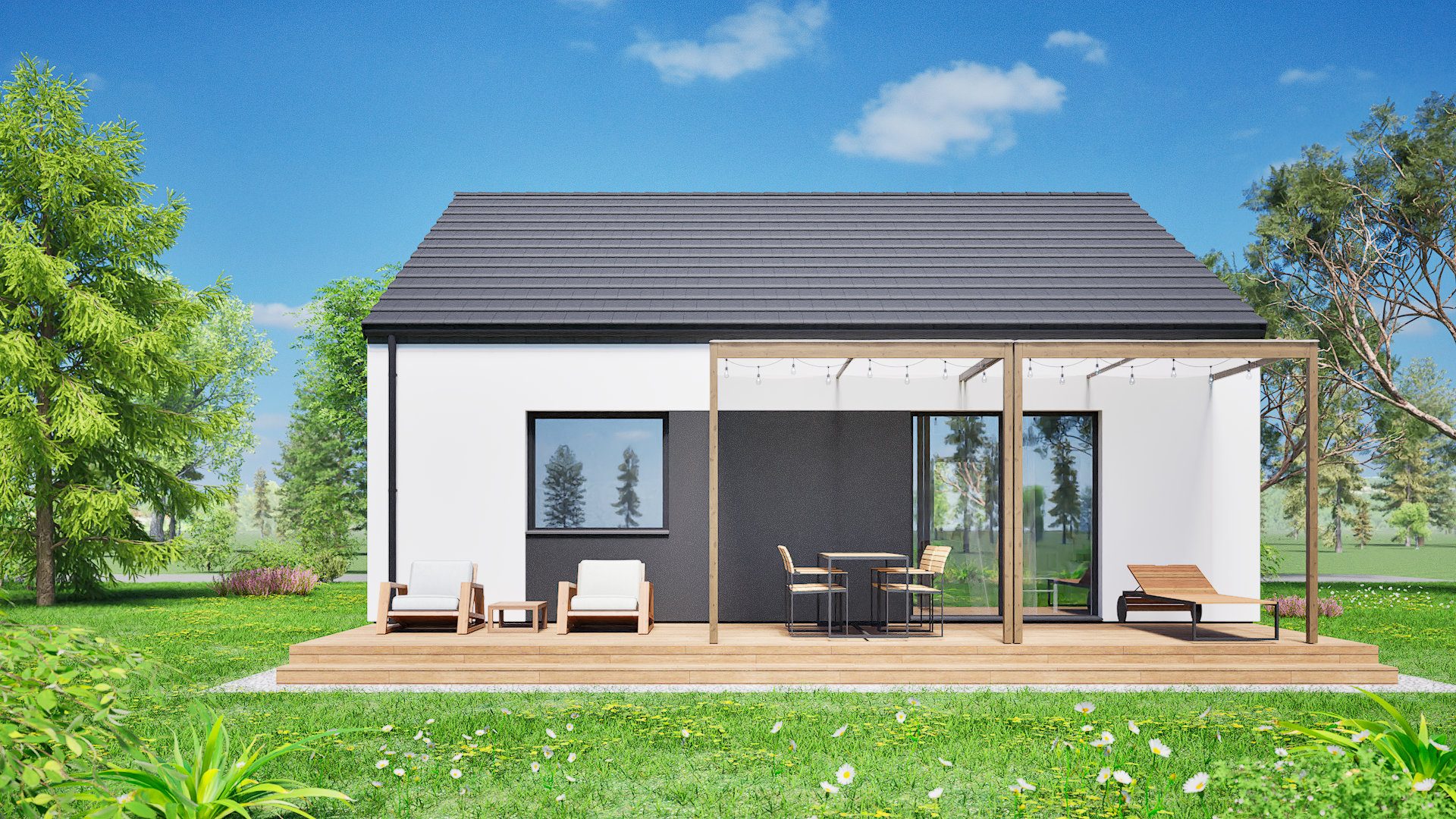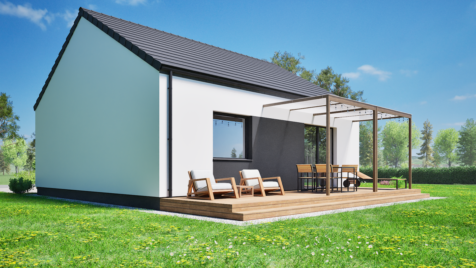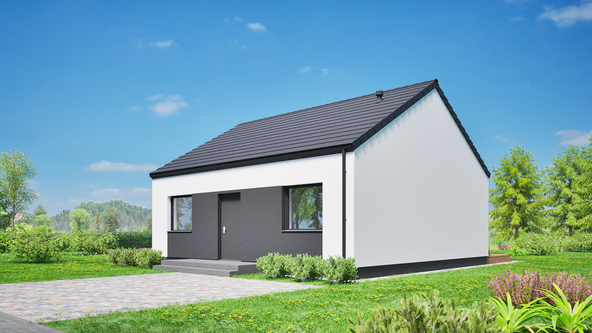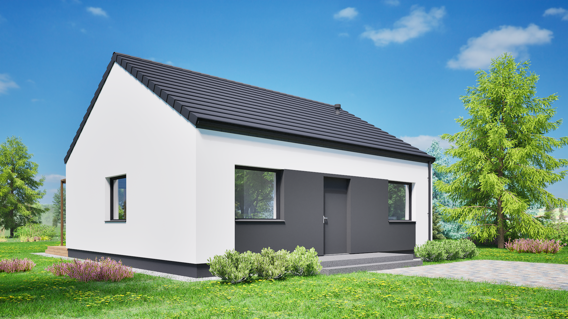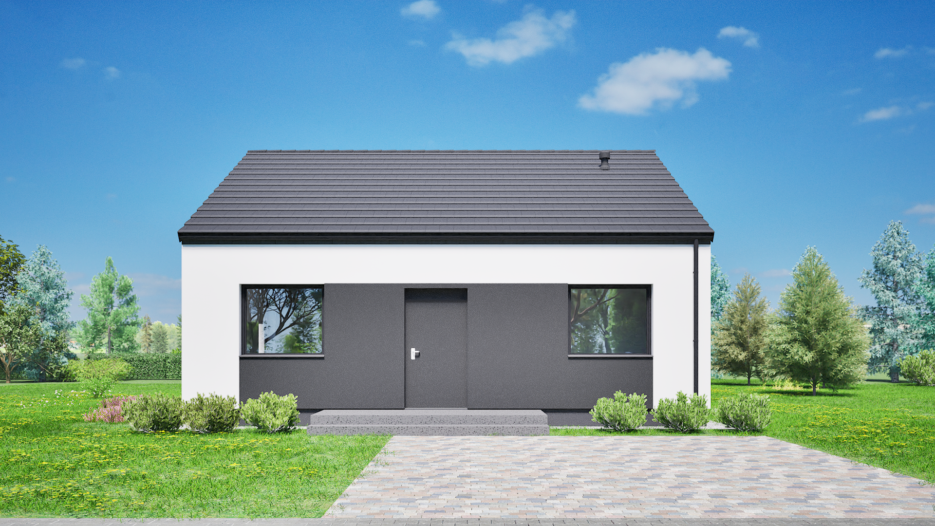 Această casă mică și economică va fi pe placul iubitorilor de arhitectură simplă. Este o clădire modernă parter cu acoperiș în două ape, pregătită pentru adaptare, în care se pot instala o pompă de căldură, recuperare termică, panouri fotovoltaice și încălzire electrică sau cu infraroșu.