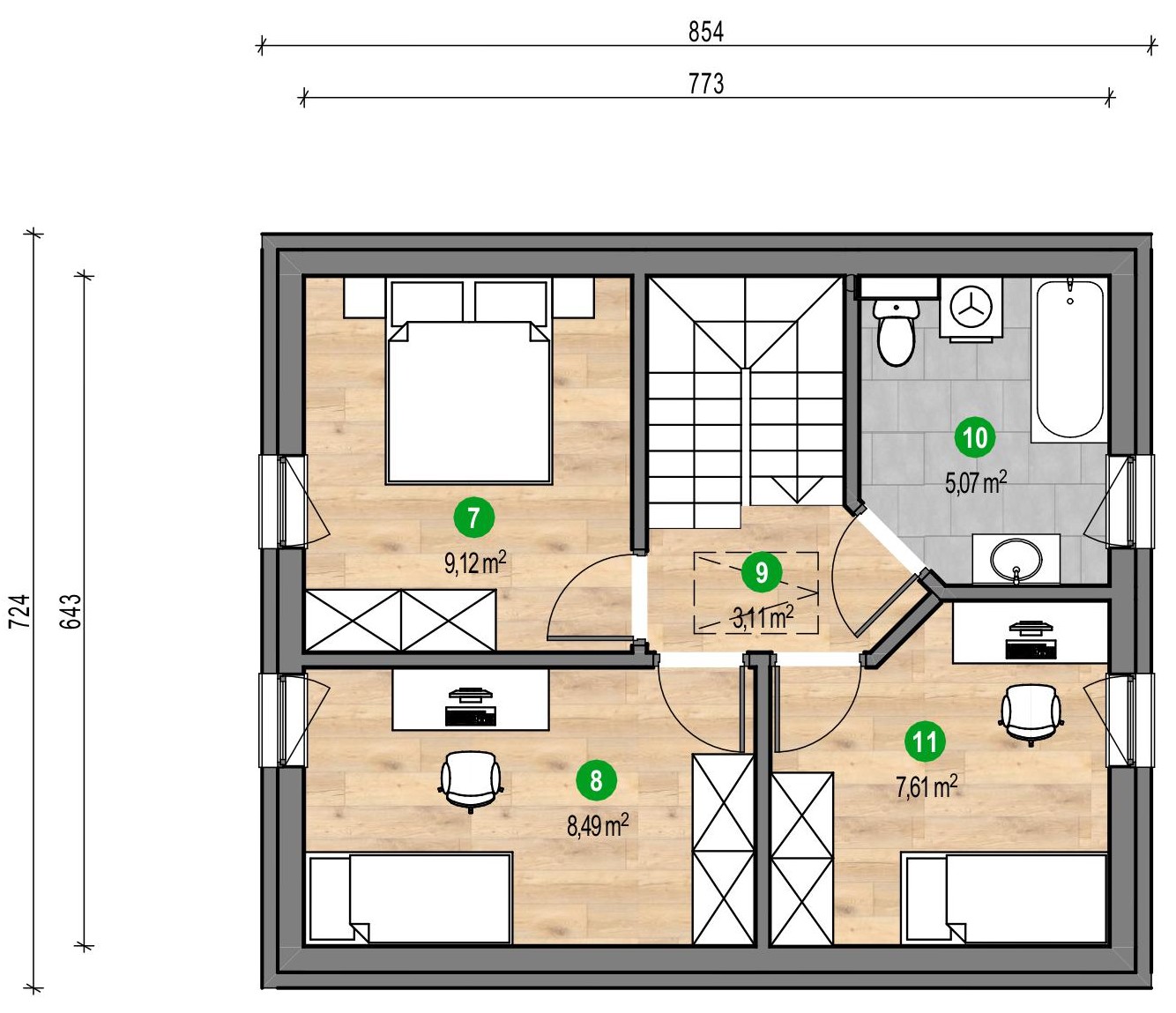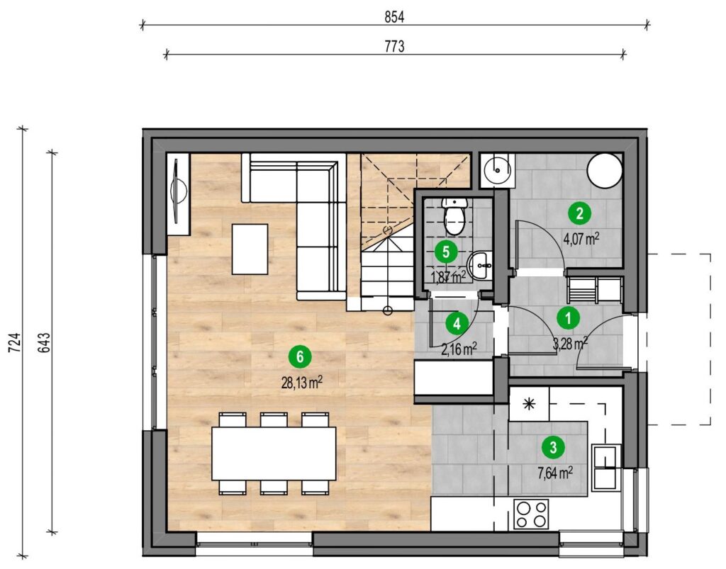 ECO 81 este un proiect de casă eficientă energetic, ce reprezintă o combinație între inovație și confort. Mansarda utilă oferă un spațiu suplimentar care poate servi drept dormitor spațios, birou sau cameră pentru oaspeți. Zona de zi, cuprinzând livingul, sufrageria și bucătăria, este orientată către terasă și grădină, iar ferestrele mari garantează o iluminare naturală excelentă în fiecare zi a anului. Întregul parter este completat de o toaletă bine integrată în structură și de o cameră tehnică spațioasă.