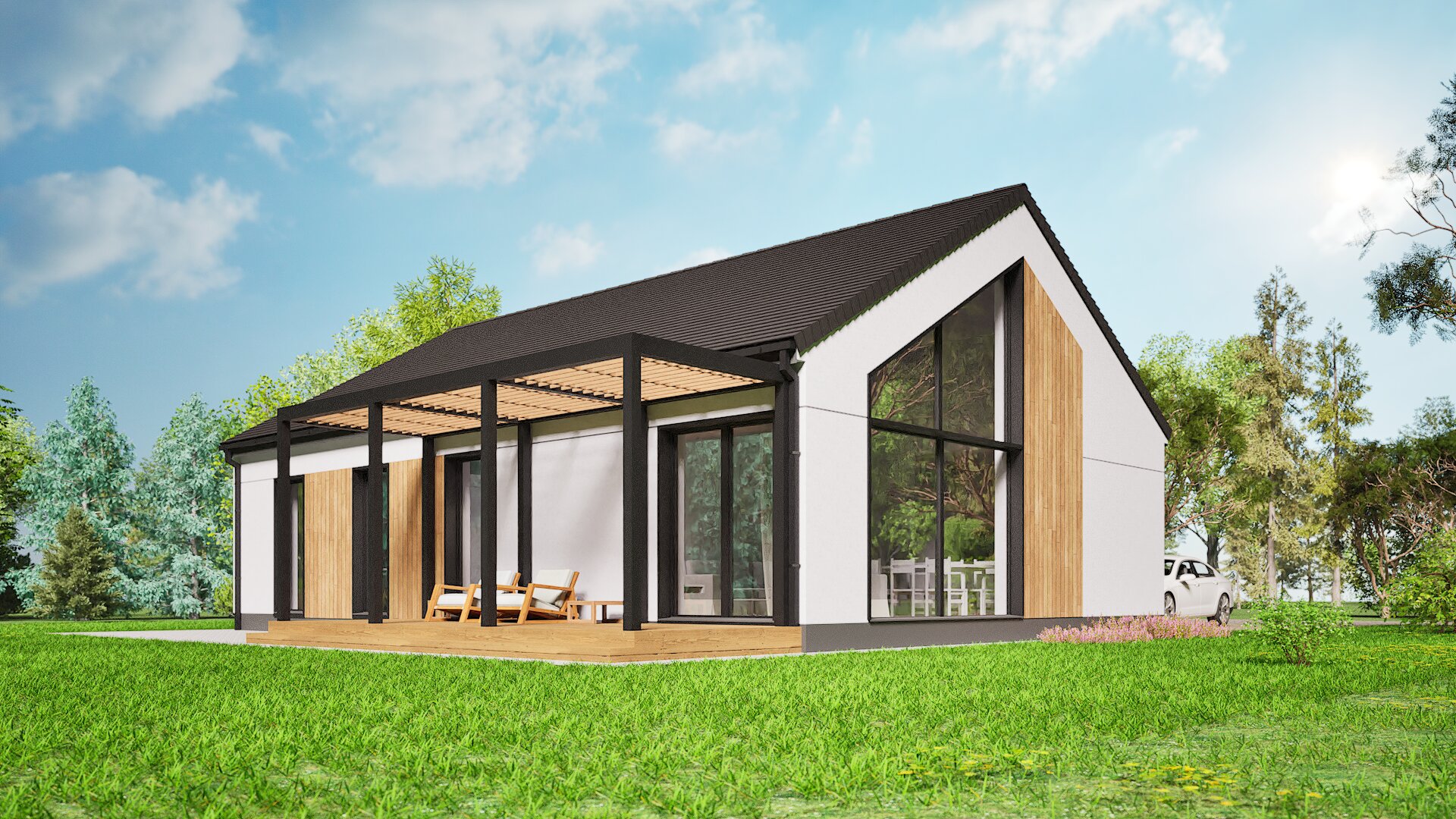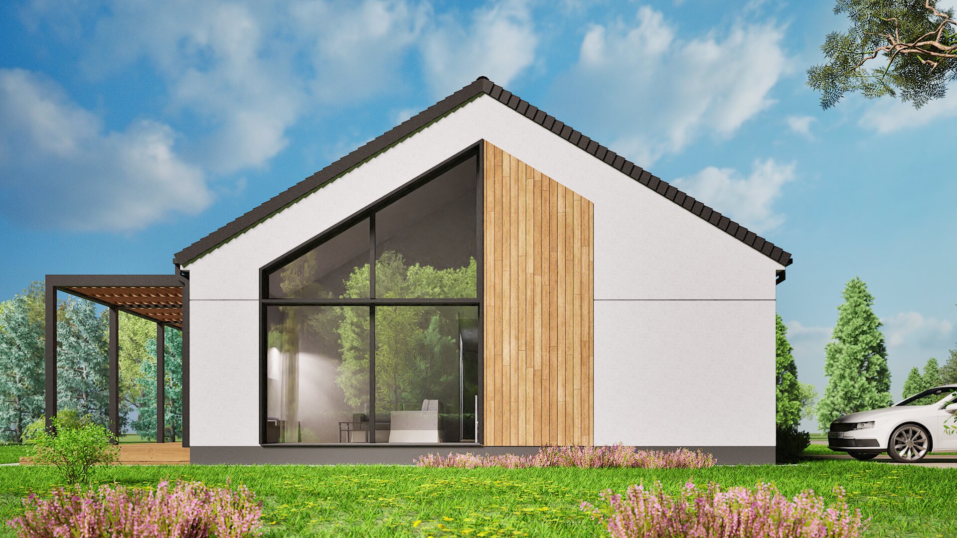 Acest proiect de casă unifamilială este soluția ideală pentru iubitorii stilului modern și a soluțiilor arhitecturale practice. Casa se remarcă printr-un volum simplu, care combină armonios estetica minimalistă cu funcționalitatea. Elementul cheie al proiectului este tavanul înalt tip catedrală, care creează un spațiu plin de lumină și aer, conferind interiorului un caracter unic. Ferestrele mari din față oferă o priveliște minunată spre grădină și fac ca încăperile să devină luminoase și spațioase.
