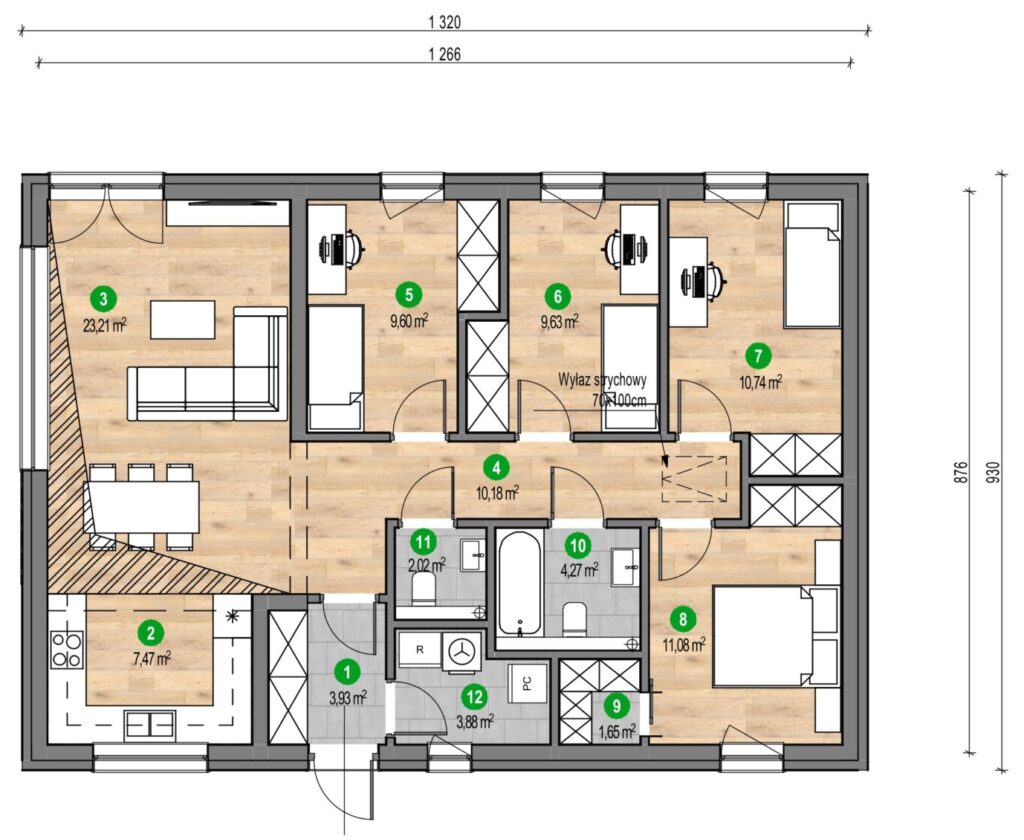 Casa a fost proiectată având în vedere confortul utilizatorilor. Planul funcțional parter asigură comoditate atât pentru familiile cu copii, cât și pentru persoanele în vârstă. Partea centrală a casei este un living spațios, combinat cu zona de luat masa și bucătăria deschisă. Zona privată include dormitoare confortabile cu acces la baie. Un avantaj suplimentar este terasa acoperită, care este perfectă pentru relaxare în aer liber.