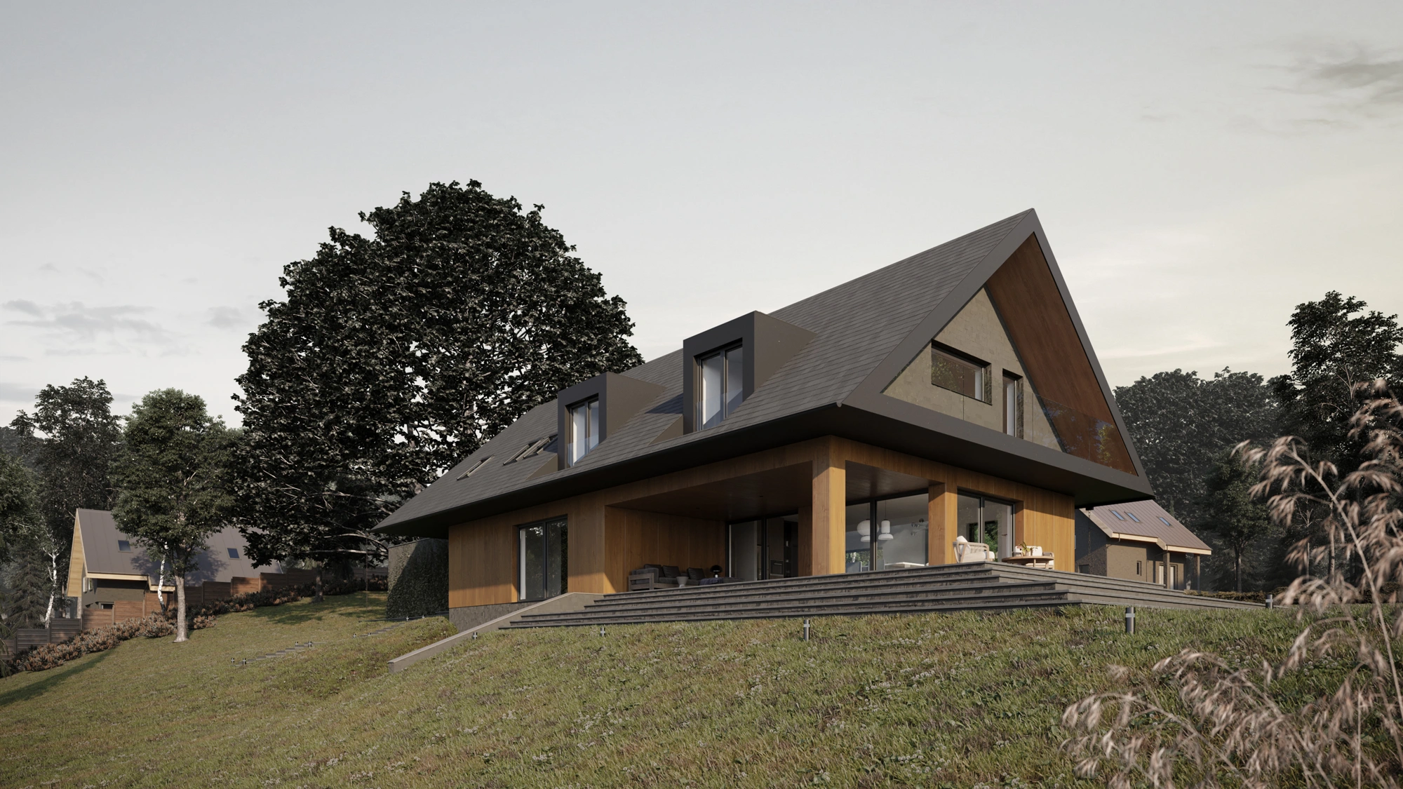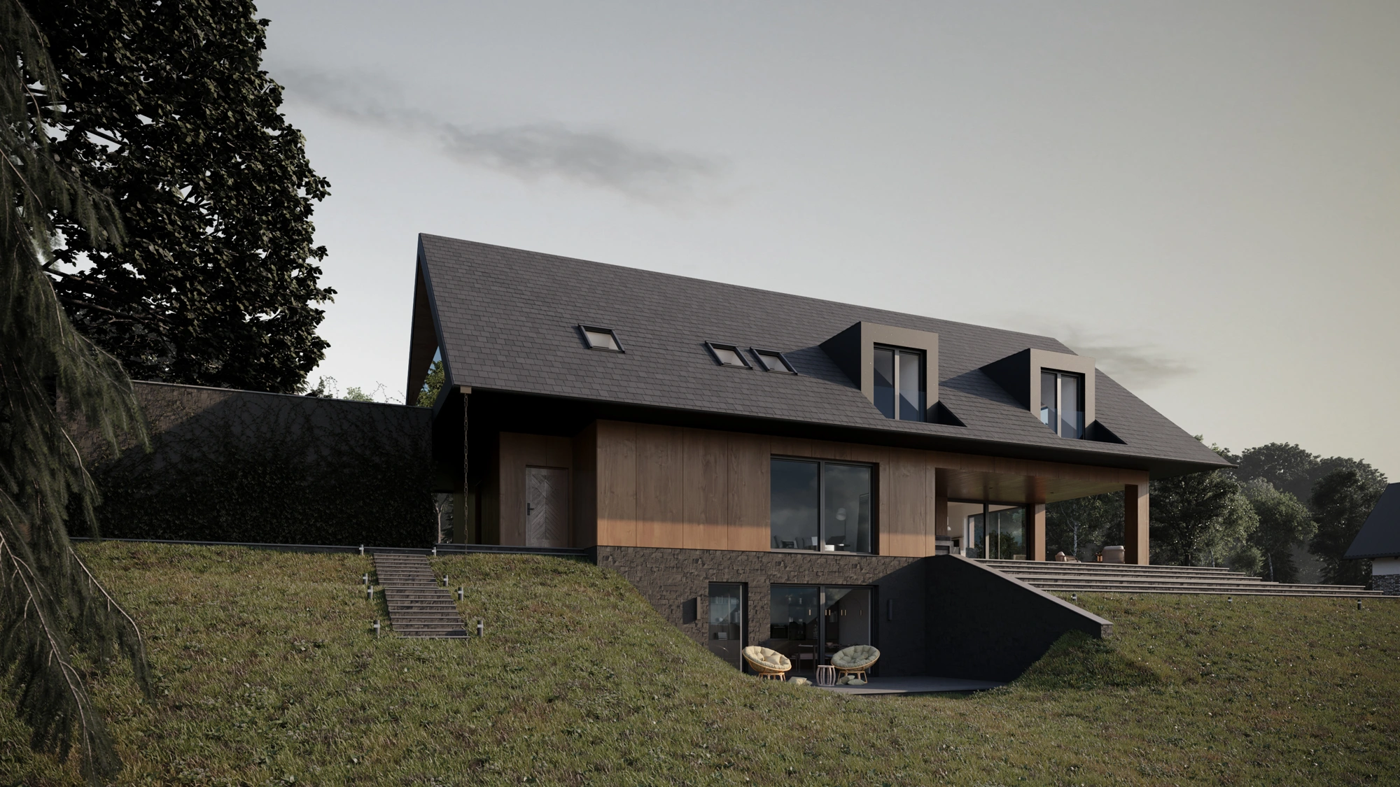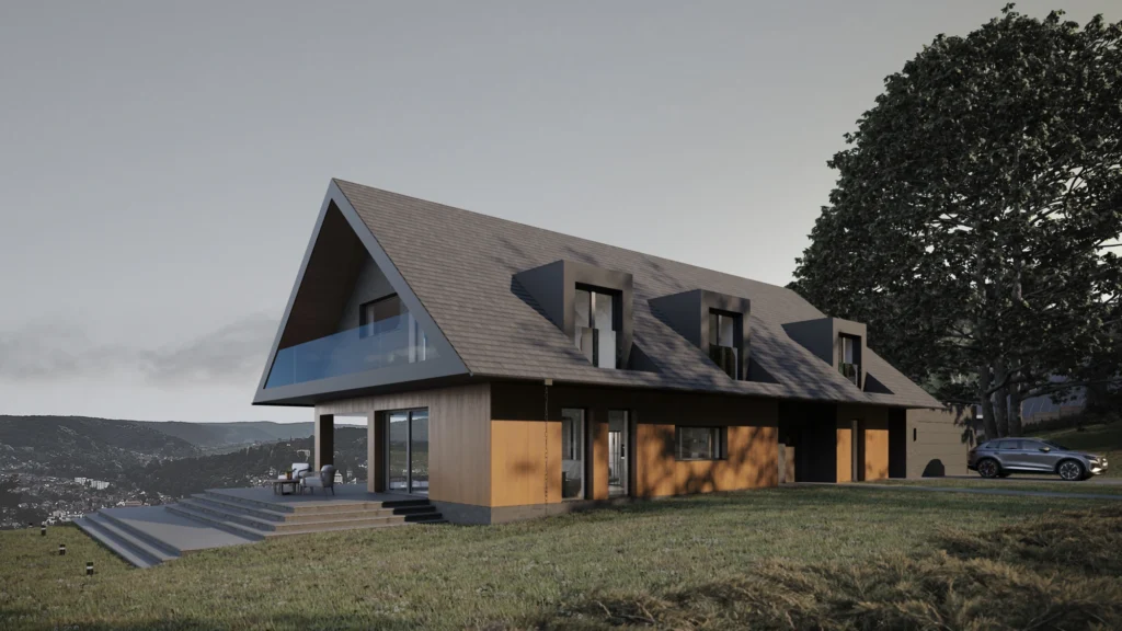 Ferestre mari și terase incluse în proiect luminează încăperile și fac orizontul să pară la îndemână. Lemnul și ardezia folosite la fațadă sunt materiale naturale care conferă un caracter rustic întregii clădiri. Casa cu vedere la oraș în depărtare este o adevărată bijuterie arhitecturală și un loc în care se poate admira o panoramă impresionantă. Mariile suprafețe vitrate și terasele încurajează savurarea priveliștilor frumoase și permit pătrunderea luminii naturale în interior, ceea ce le face să pară mai spațioase.