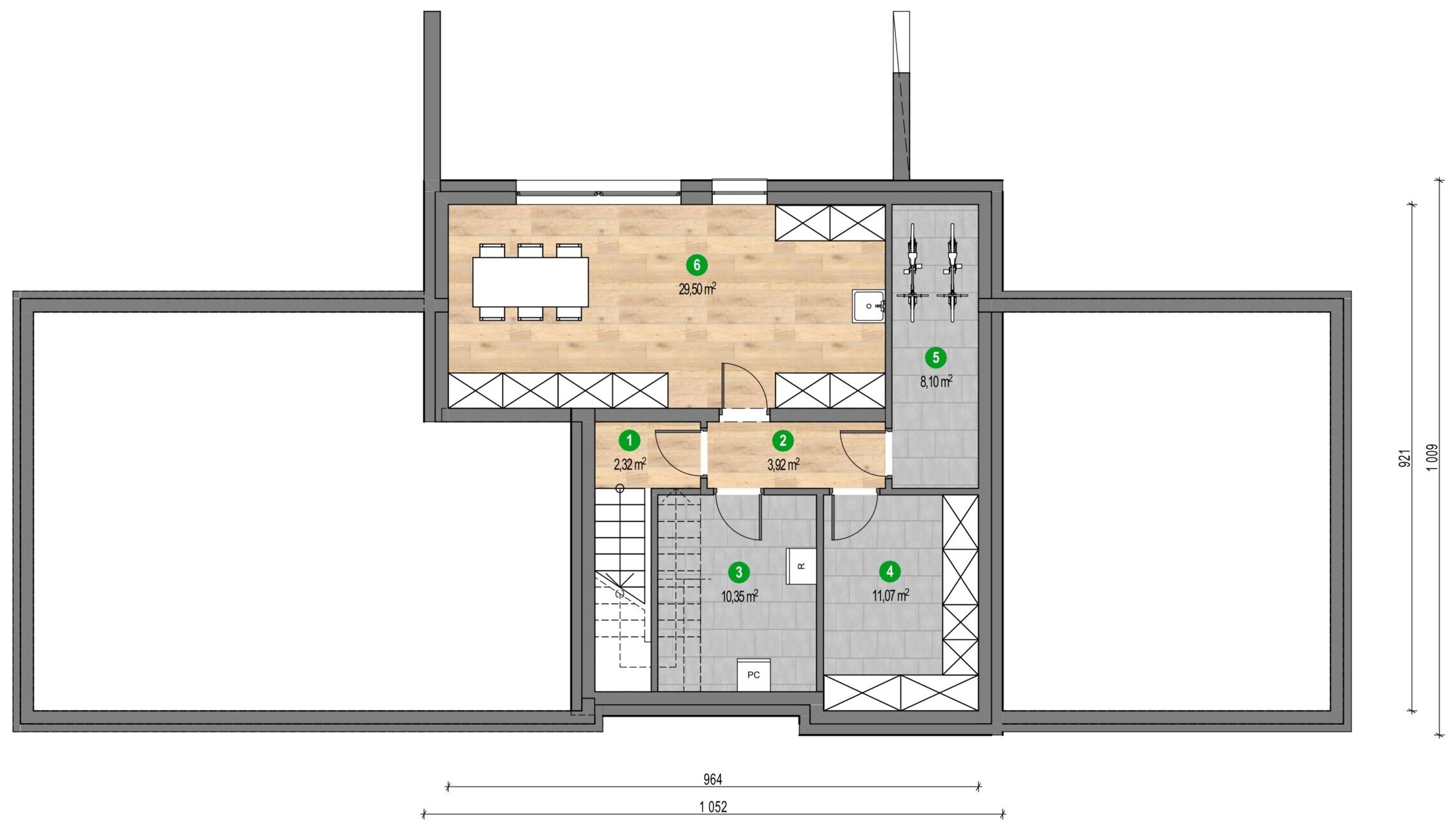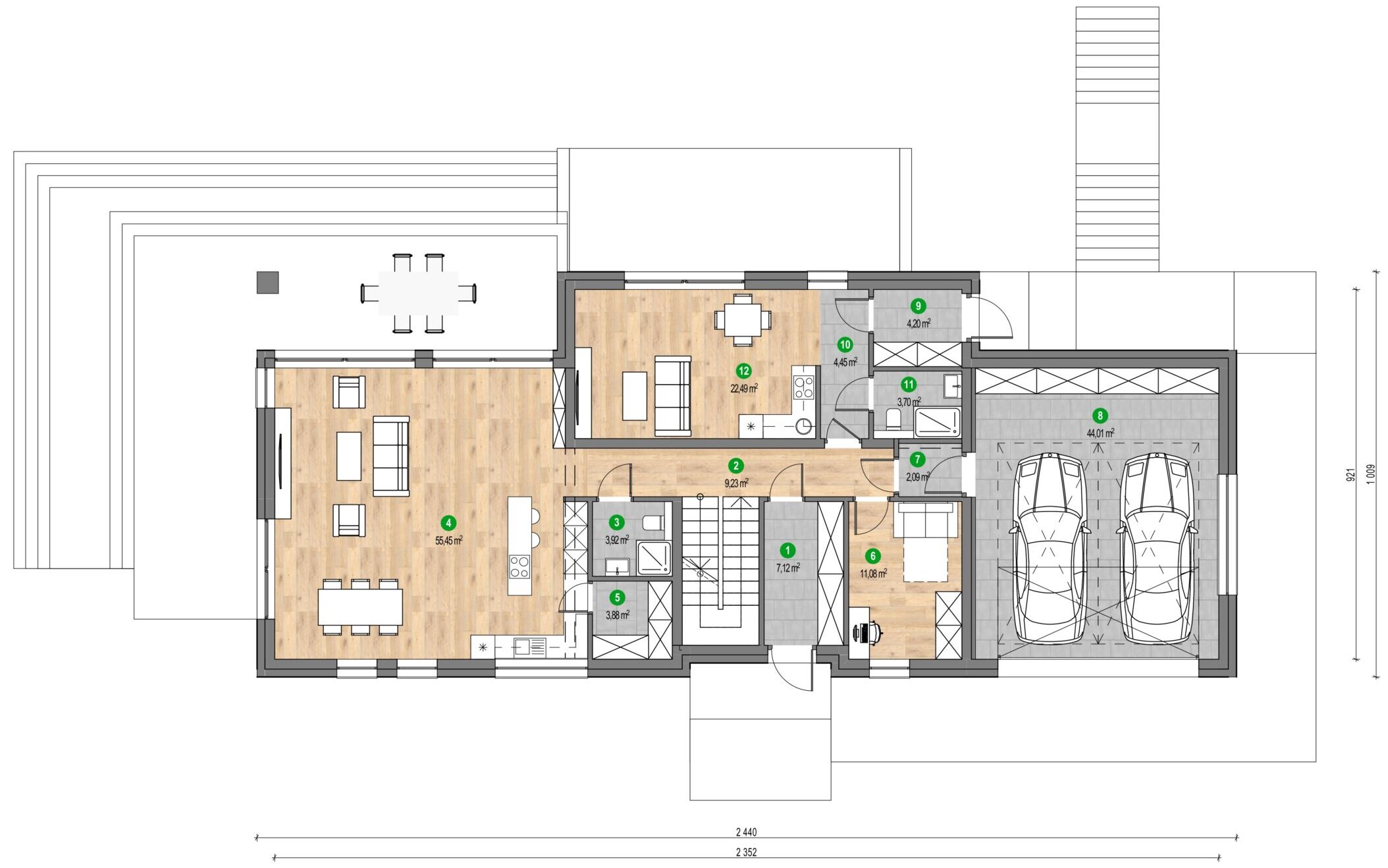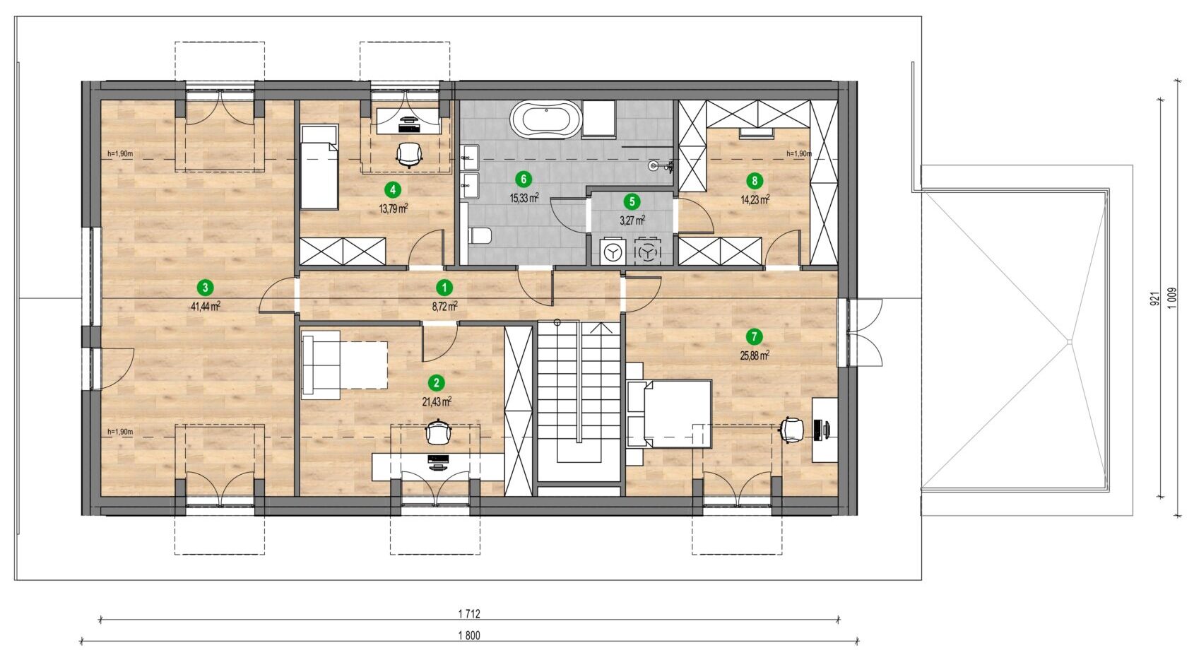 Ferestre mari și terase incluse în proiect luminează încăperile și fac orizontul să pară la îndemână. Lemnul și ardezia folosite la fațadă sunt materiale naturale care conferă un caracter rustic întregii clădiri. Casa cu vedere la oraș în depărtare este o adevărată bijuterie arhitecturală și un loc în care se poate admira o panoramă impresionantă. Mariile suprafețe vitrate și terasele încurajează savurarea priveliștilor frumoase și permit pătrunderea luminii naturale în interior, ceea ce le face să pară mai spațioase.