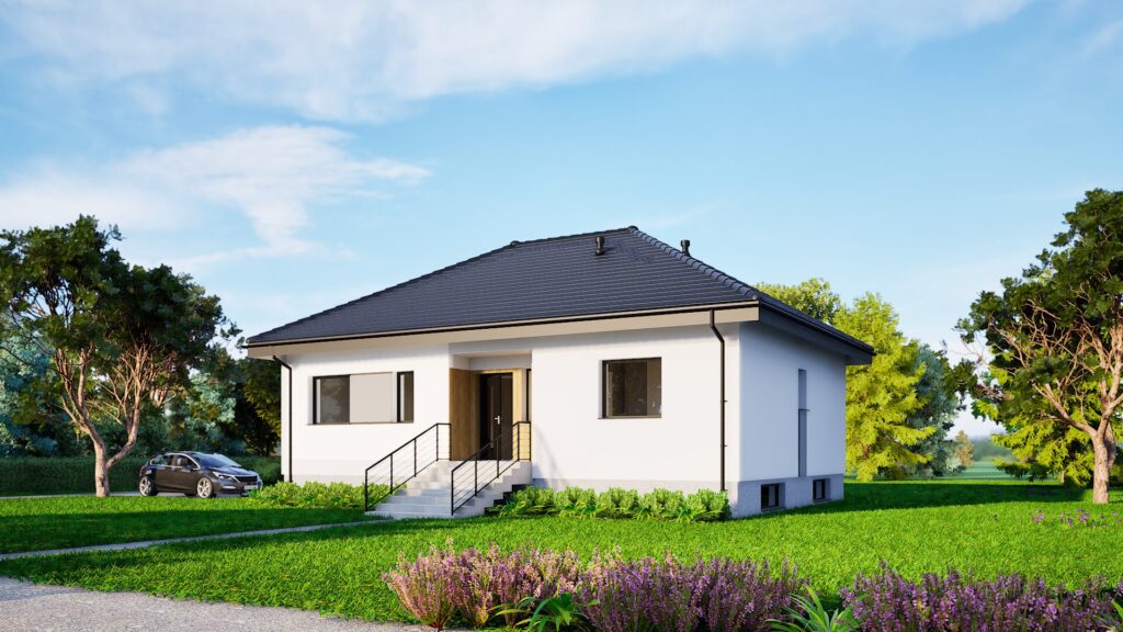 Acest proiect este o casă modernă parter, ideală pentru o familie care caută o soluție funcțională și estetică. Clădirea, cu o formă compactă și dreptunghiulară, combină un aspect clasic cu accente moderne. Fațada este luminoasă, cu panouri din lemn, care îi conferă eleganță și un aspect natural. Acoperișul în șarpantă asigură un caracter tradițional, iar geamurile mari aduc multă lumină naturală în interior, sporind confortul utilizării.
