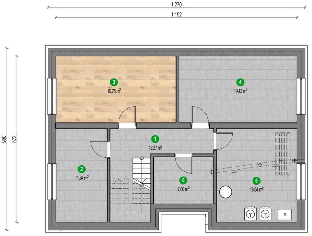 Casa este proiectată într-un mod gândit și funcțional. Interiorul constă într-o zonă de zi spațioasă, care cuprinde livingul, sufrageria și o bucătărie deschisă. Zona de noapte include dormitoare confortabile și o baie, garantând intimitatea locatarilor. Proiectul ia în considerare și o cameră de serviciu, precum și o centrală termică, ceea ce facilitează funcționarea zilnică.