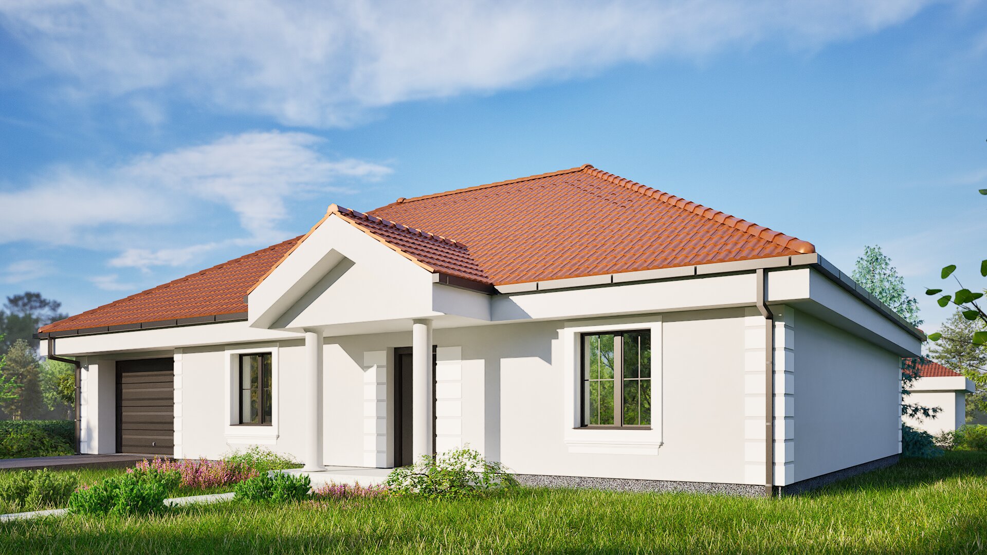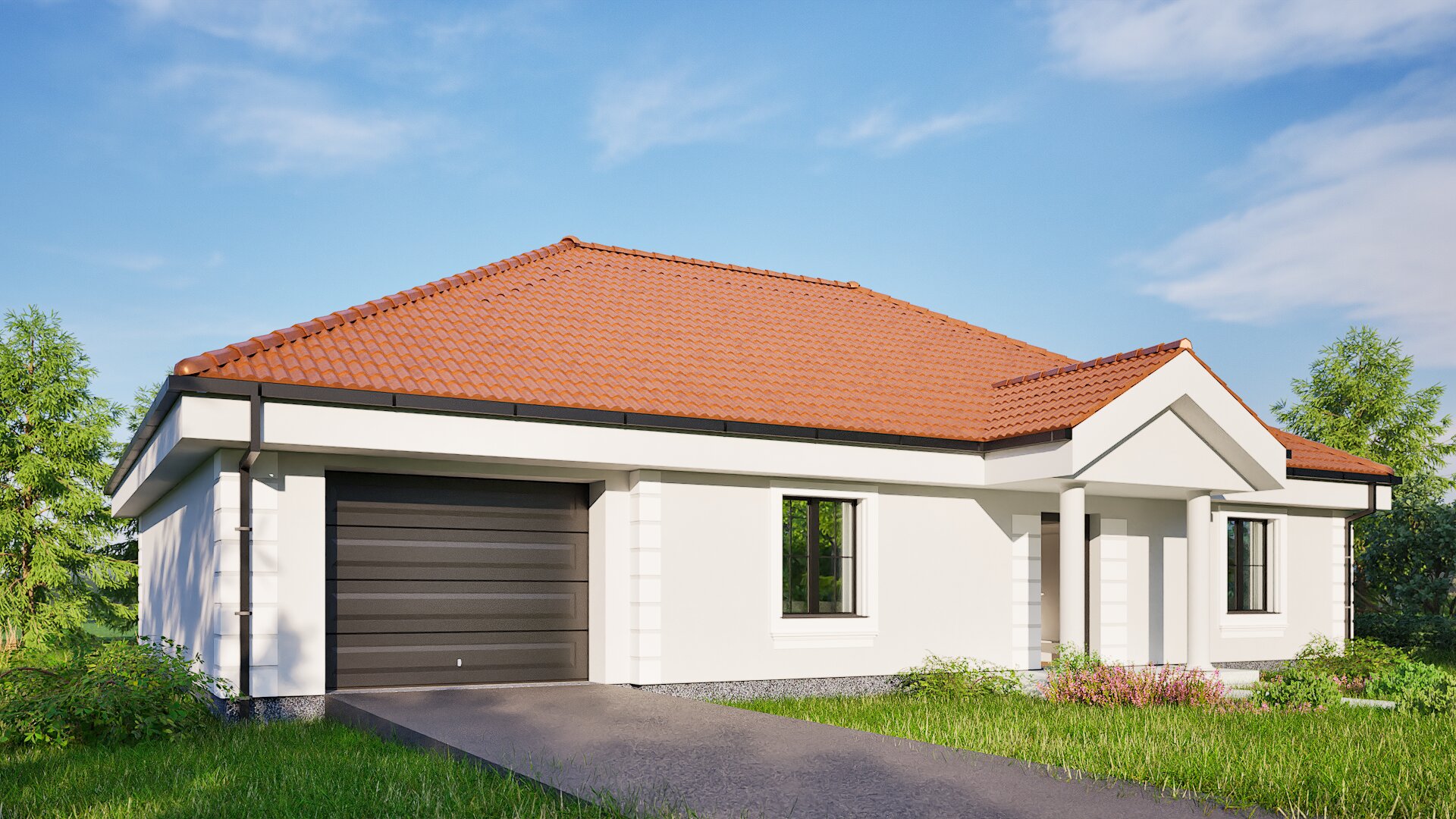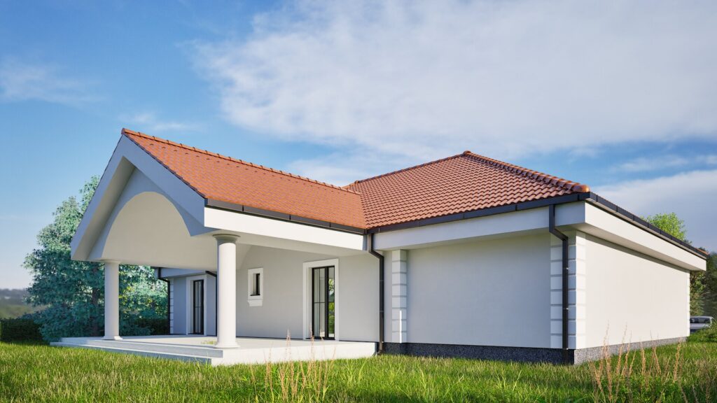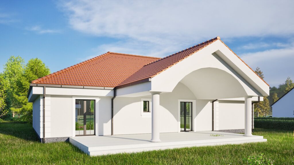 Casa prezentată în fotografii este un proiect clasic cu un singur nivel, cu un design elegant care îmbină funcționalitatea cu estetica. Construcția se remarcă prin linii simple și armonioase, iar acoperișul roșu din țigle contrastează perfect cu fațada deschisă la culoare, conferind clădirii un caracter aparte. Partea exterioară a casei este completată de stâlpi ornamentali care susțin coperta de deasupra intrării, subliniind stilul clasic, dar în același timp modern al clădirii.