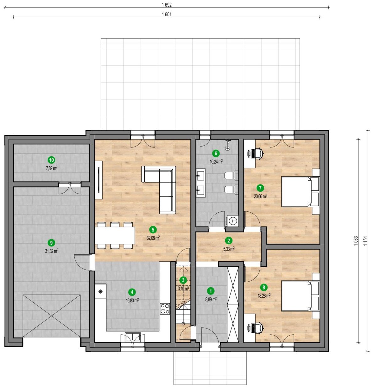 În fața casei se află un garaj spațios cu o poartă de acces elegantă, neagră, care nu doar asigură un loc pentru mașină, dar adaugă și practicitate întregului proiect. Datorită utilizării ferestrelor mari, interiorul este excelent luminat de lumina naturală, ceea ce favorizează confortul utilizării și reduce costurile de exploatare legate de iluminat. În spatele casei este proiectată o terasă spațioasă, care constituie un loc ideal pentru relaxare, precum și pentru organizarea întâlnirilor de familie în aer liber.