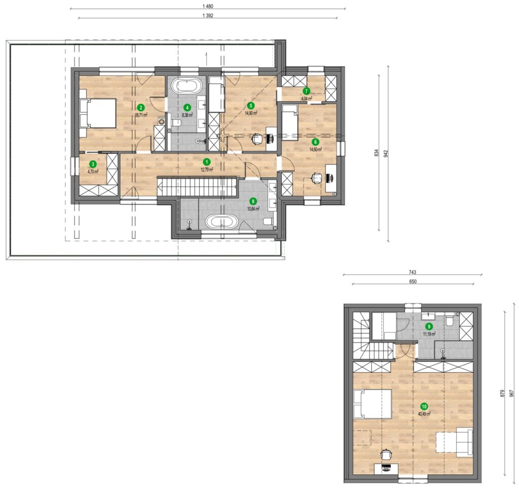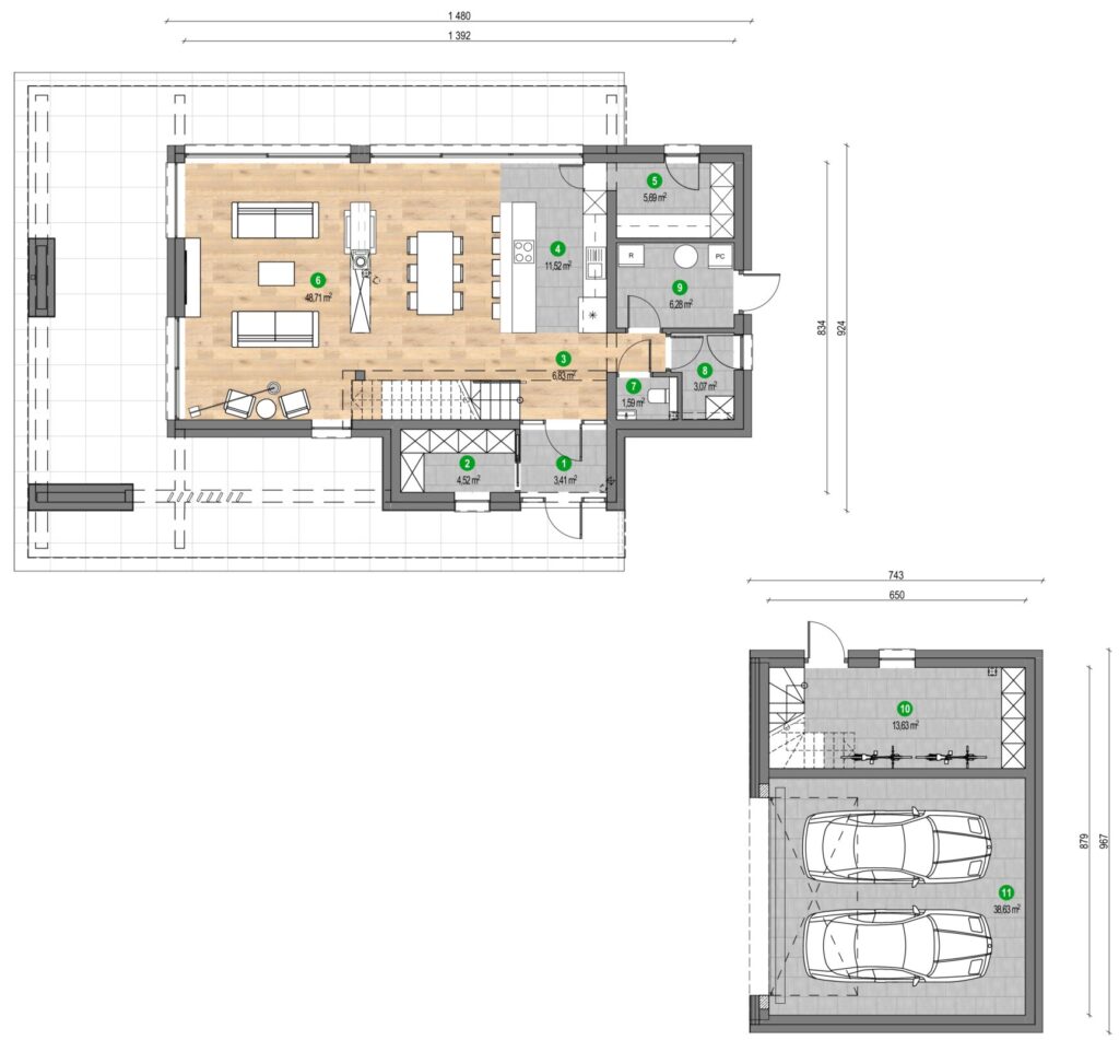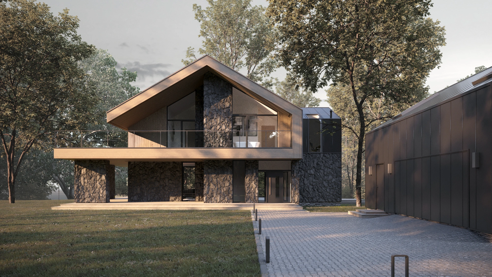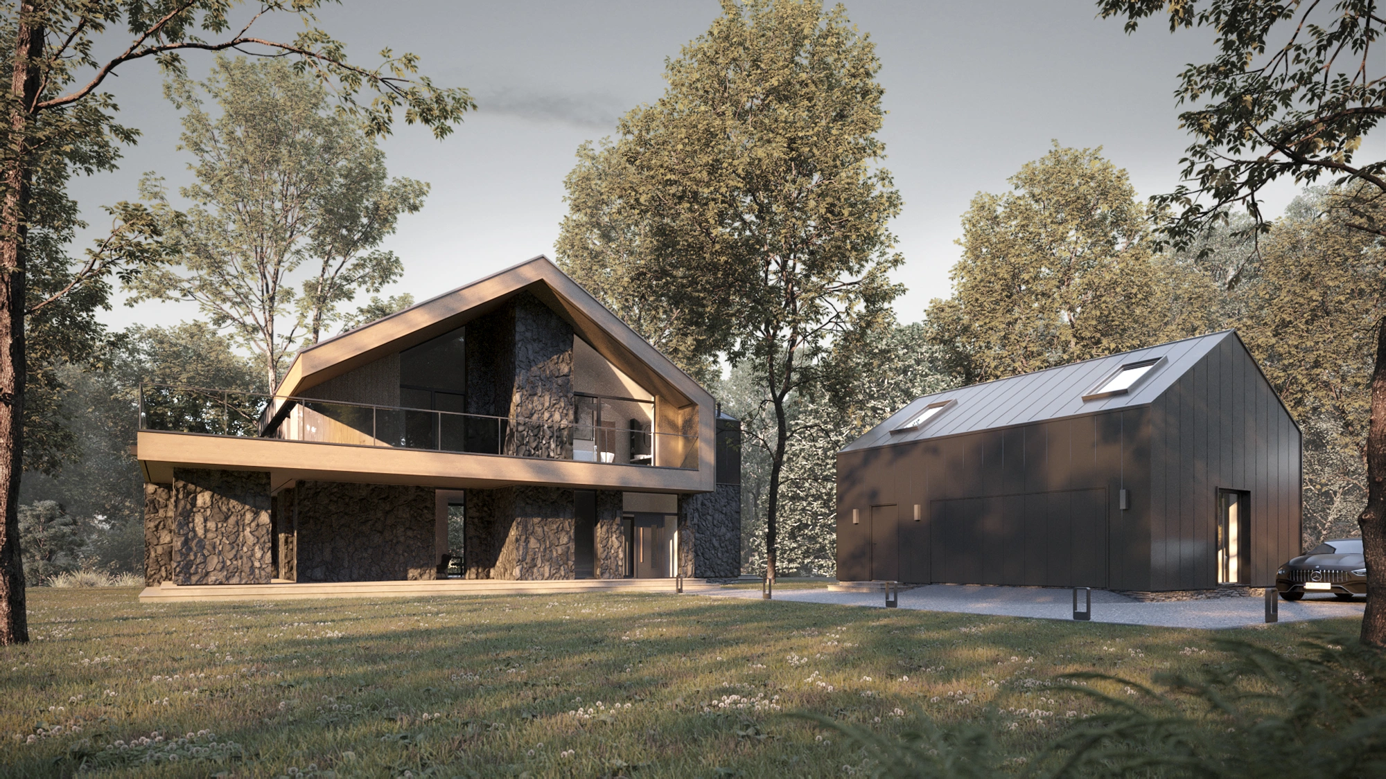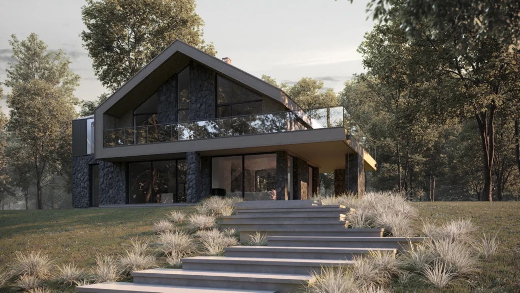 Acest proiect va interesa persoanele care preferă combinațiile moderne cu o notă de clasicism. Clădirea combină funcționalitatea parterului cu farmecul mansardei, iar ceea ce atrage atenția în mod deosebit sunt pereții mari din sticlă din living, care creează aproape un ecran de cinema pentru panorama peisajului înconjurător. Chiar alături se află un hambar de design într-o nuanță profundă de negru, subliniind caracterul unic al locului.